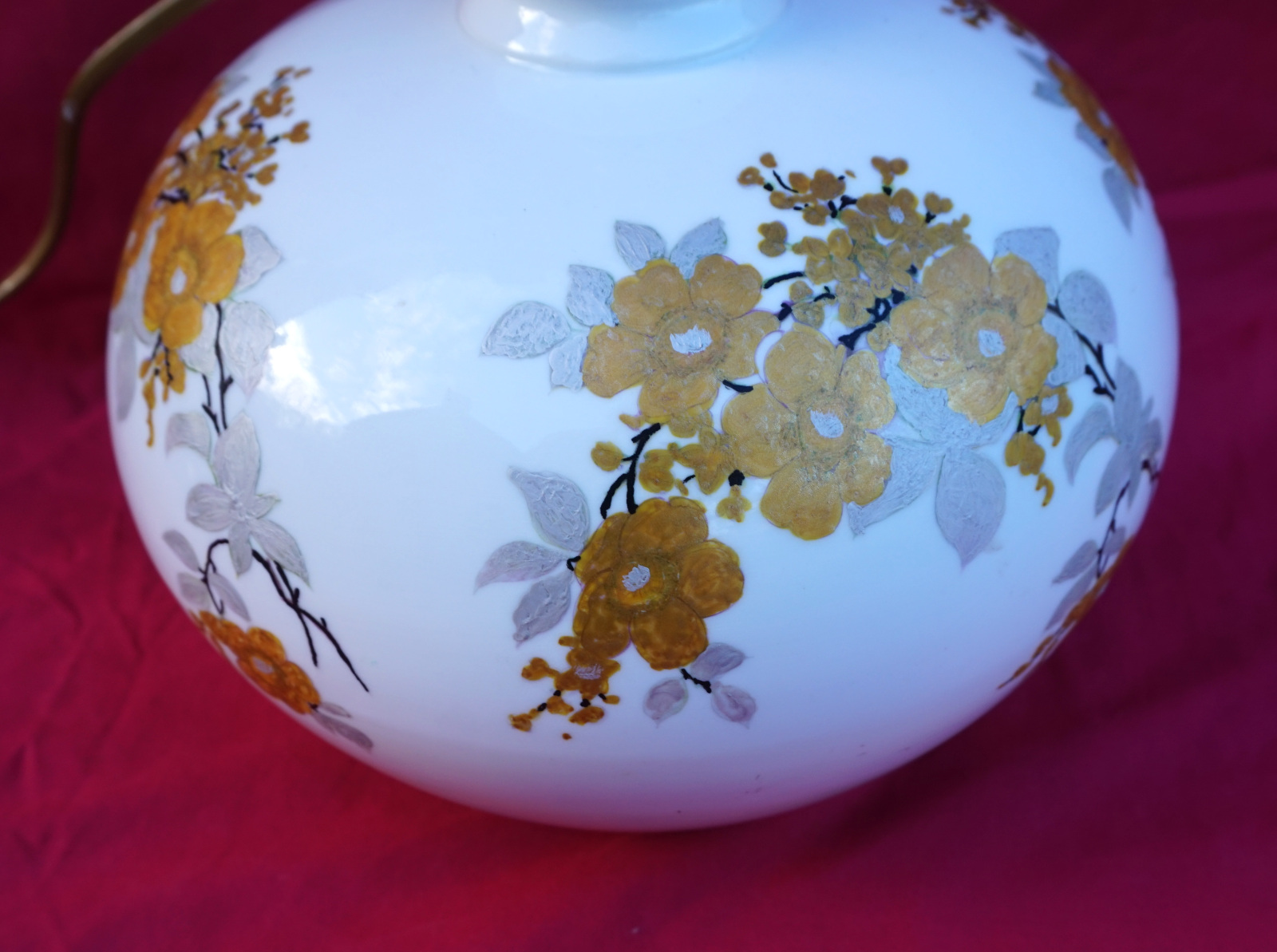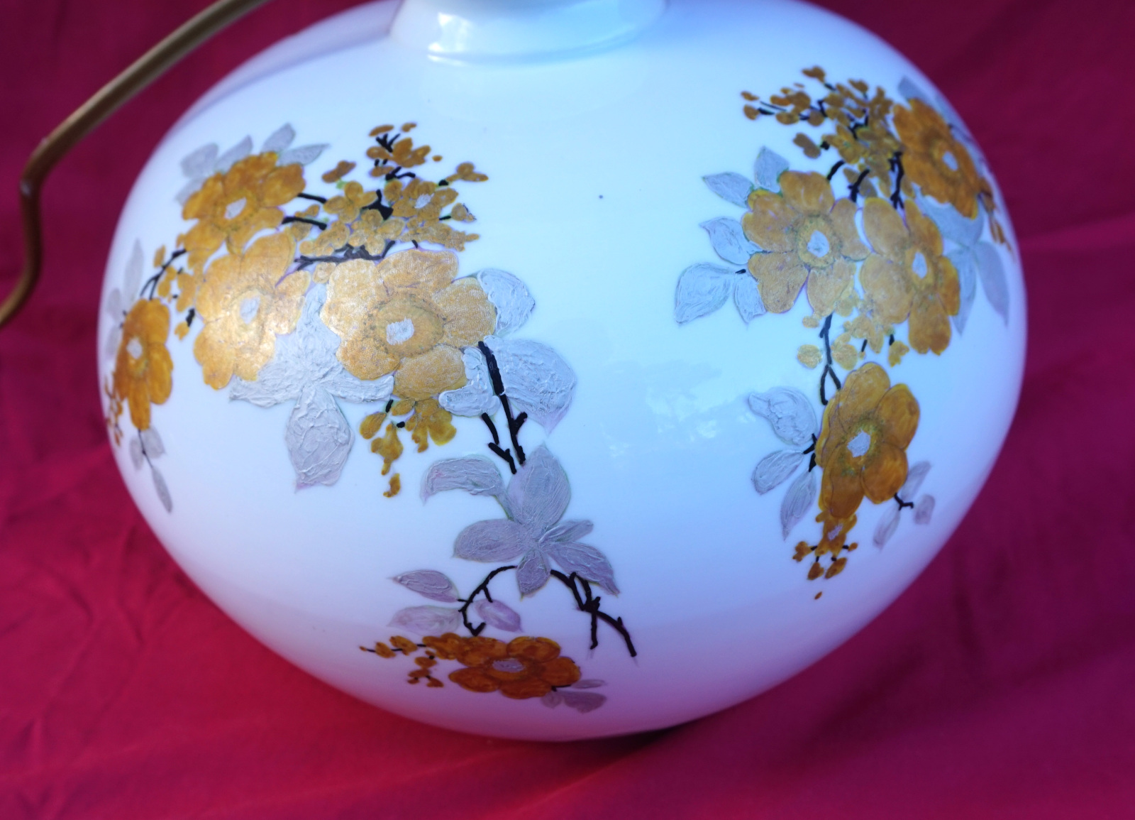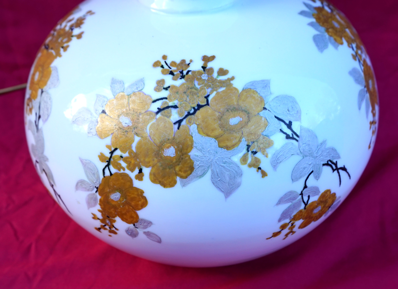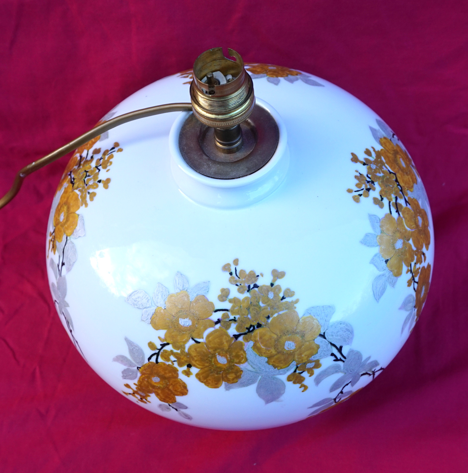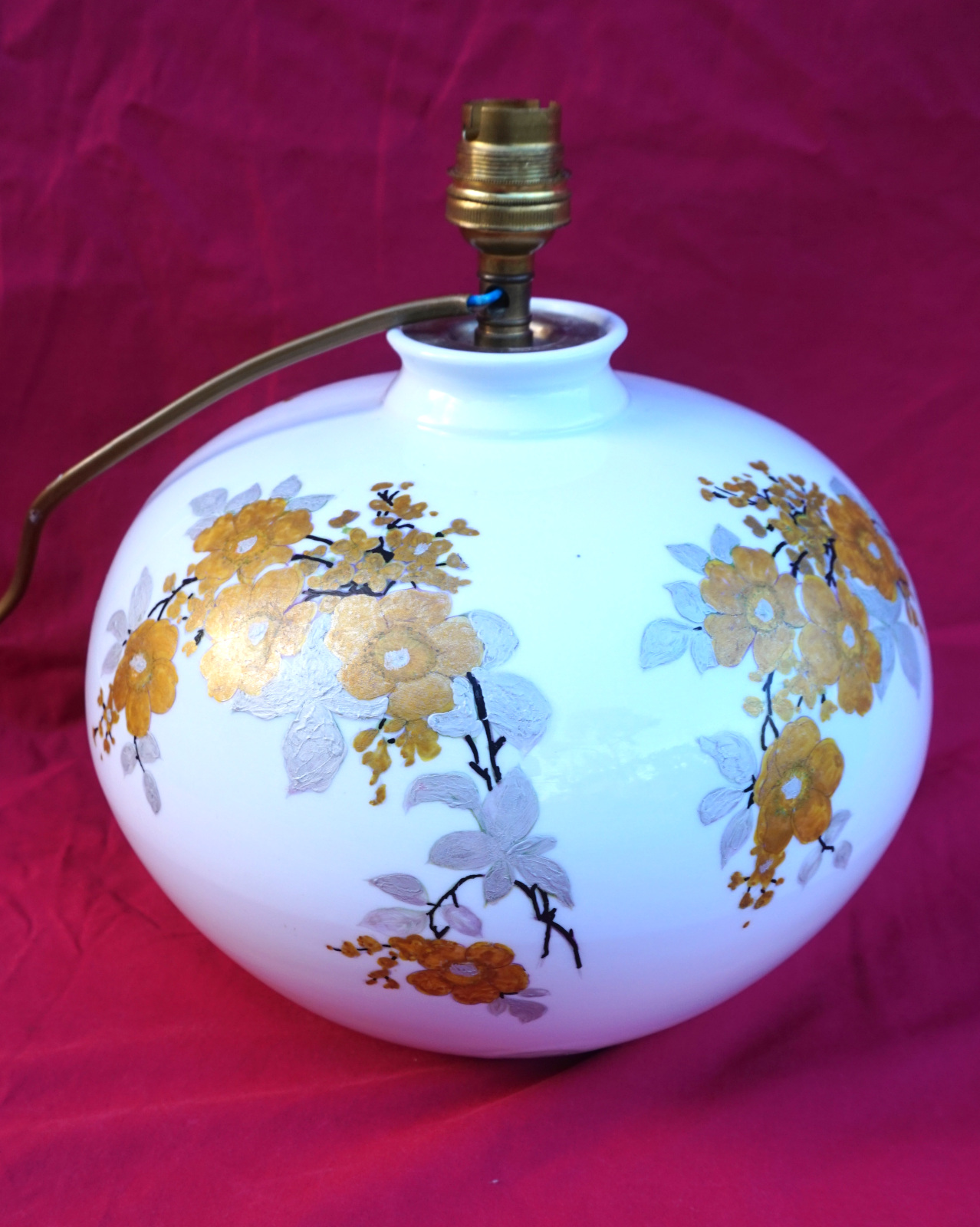 Pied de lampe boulle à décor japanisant blanc et or par J Duchamp sur une porcelaine de La Seynie Limoges, milieu XX° siècle. Il est signé sur sa base. Hauteur 19 cm, diamètre au corps 21.5 cm. Parfait état.