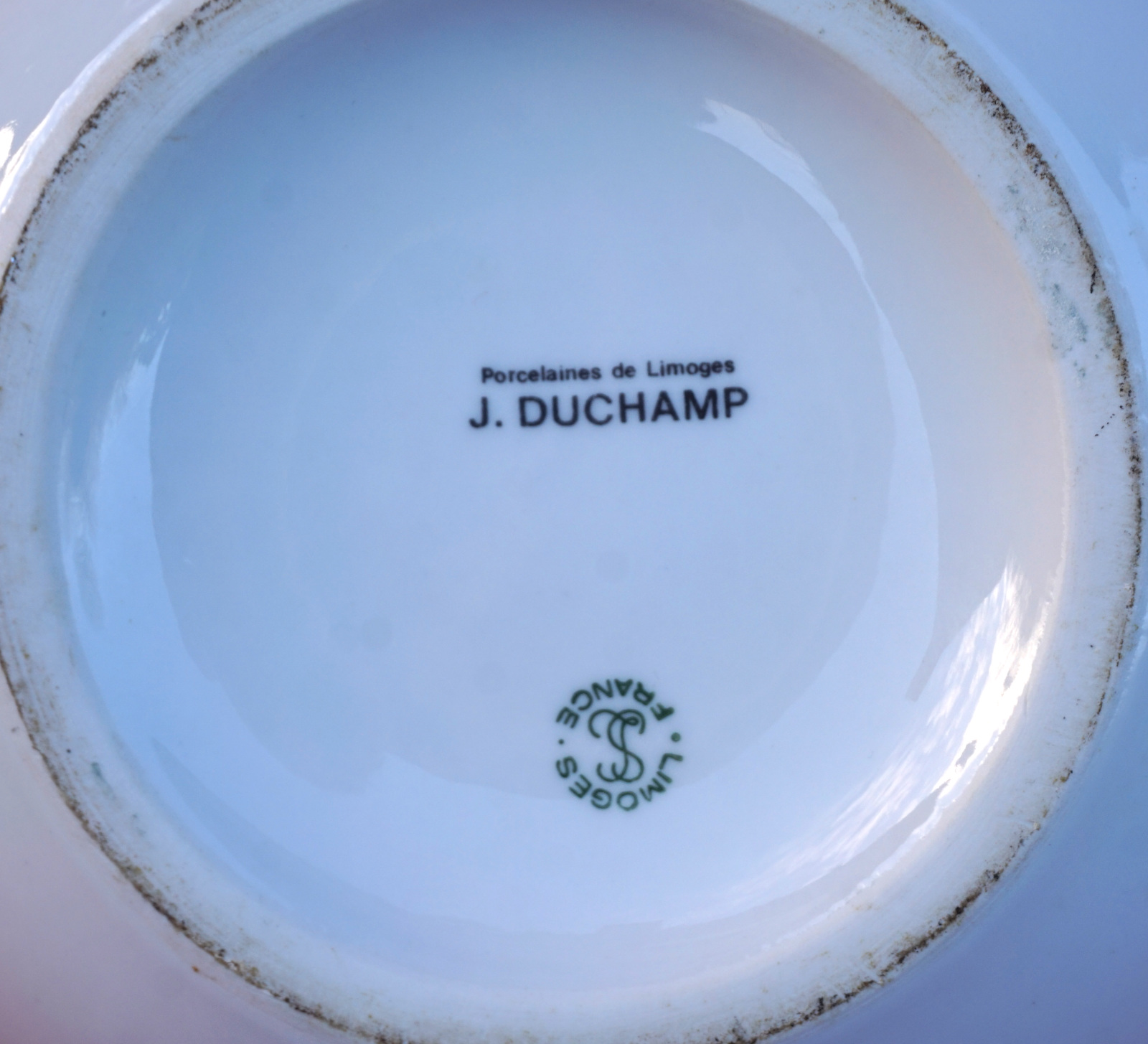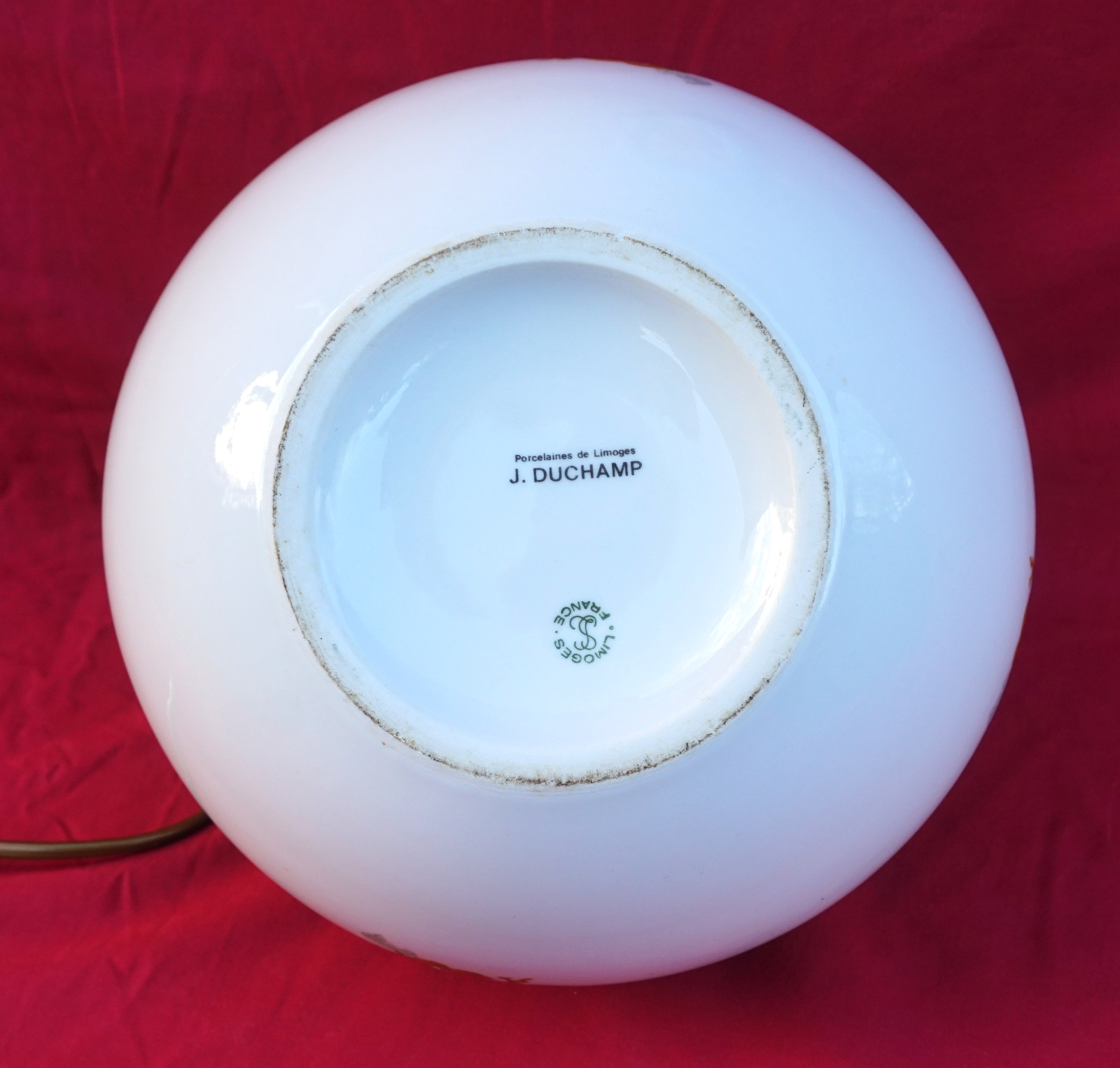 French gilt and hand painted porcelain ball lamp base made by J Duchamp Limoges during the mid-century. It's signed on the base. 7 1/2" (19cm) height, 8 1/2" (21.5cm) diameter to the body. Perfect condition
