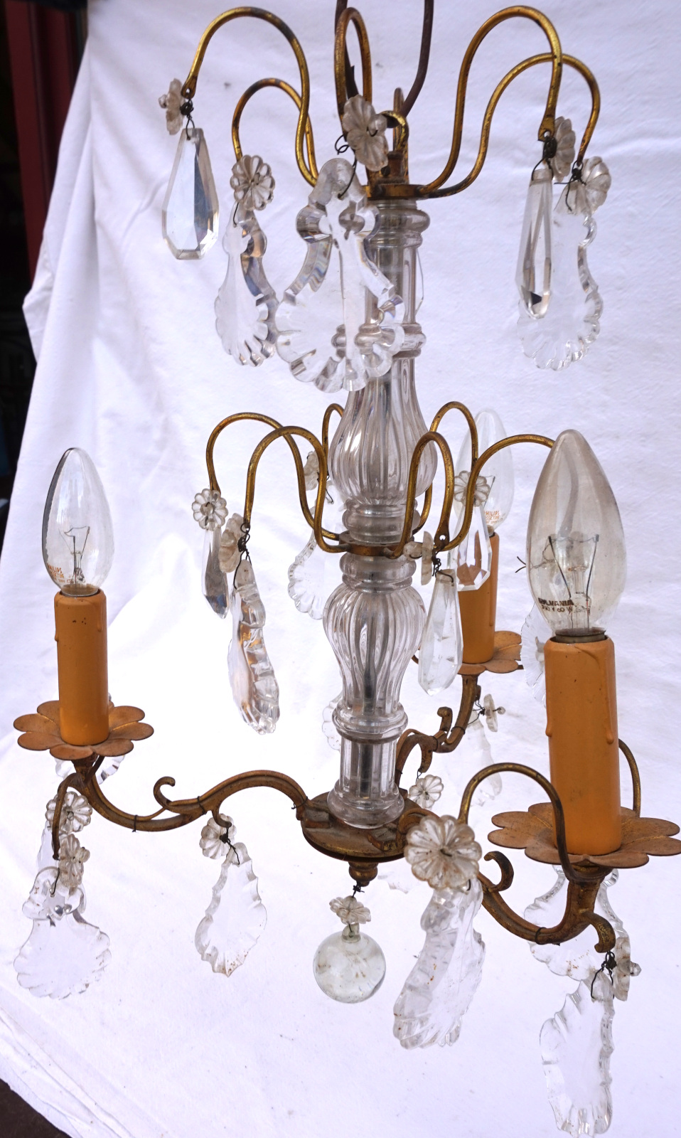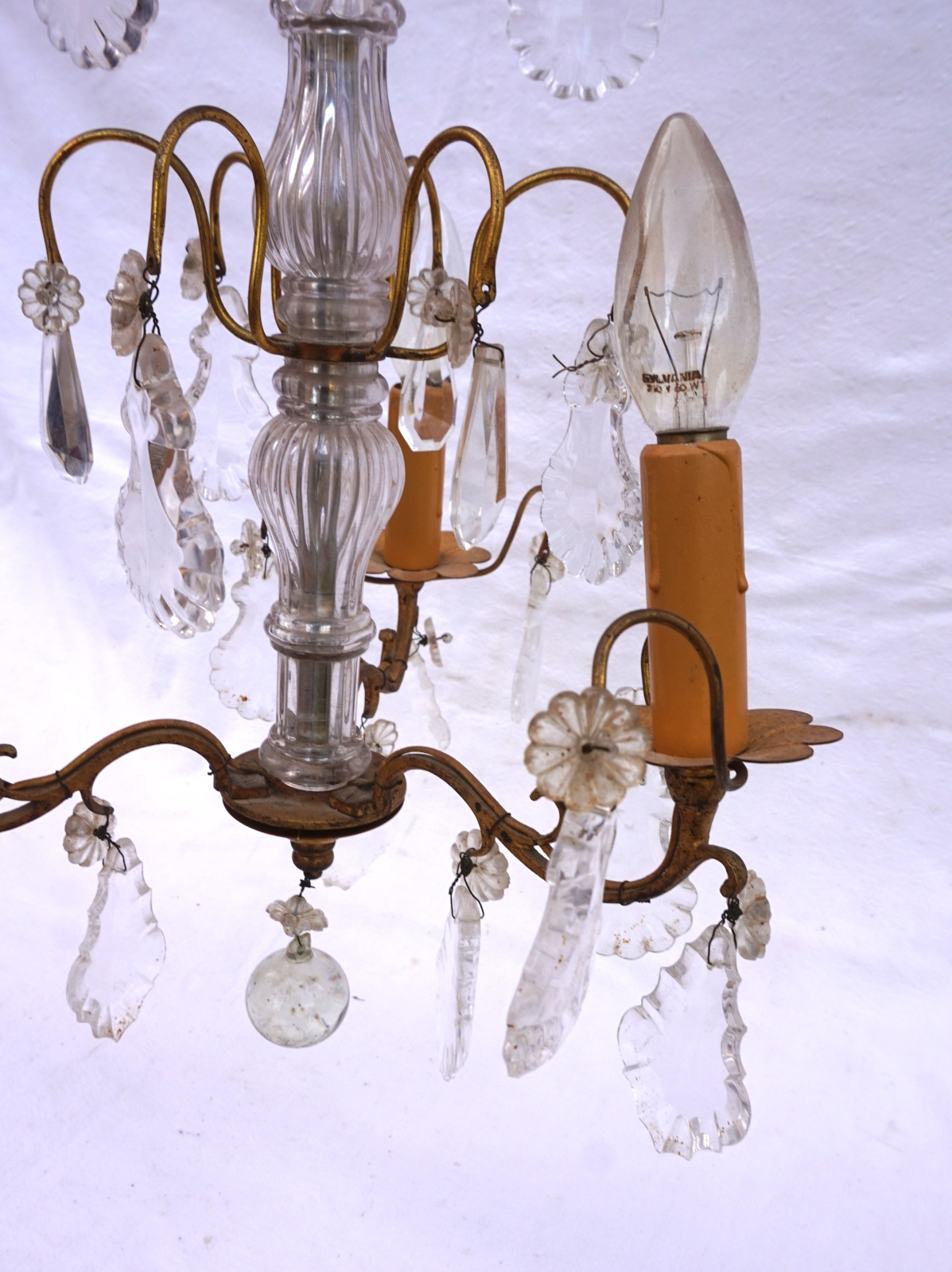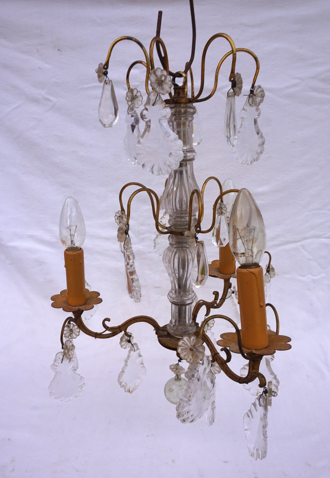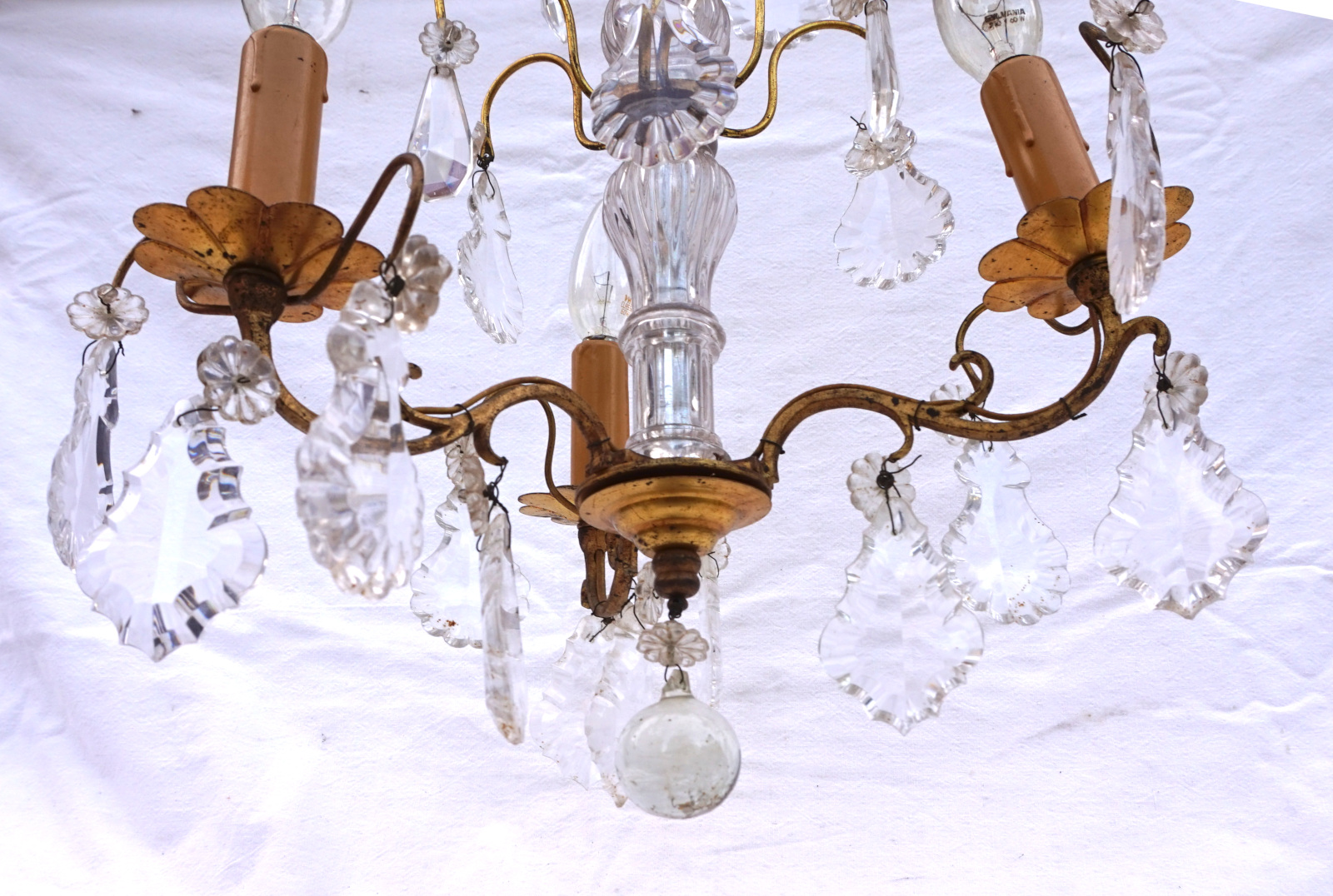 Louis XVI style Brass Bohemian Crystal 3 Lights Chandelier Ceiling Light 1940's