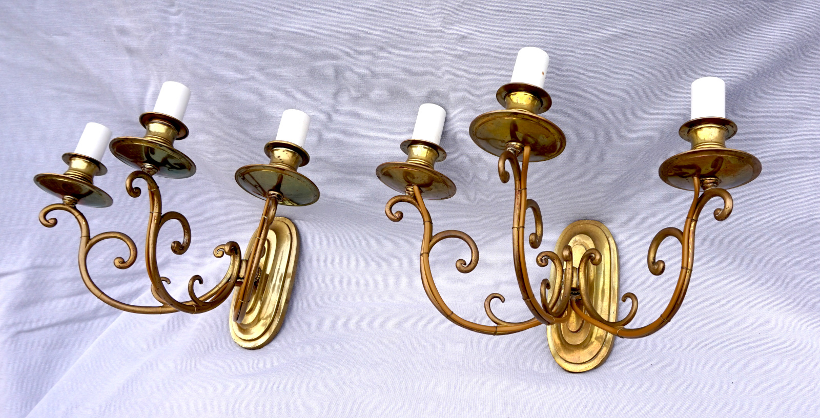 French gilt brass pair of wall sconce with 3 lights in Louis XVI style made early 20th century. 8" (20.2cm) height, 9 1/4" (23.5cm) depth, 12 1/4" (31cm) width, weight 4lb 15oz (2.240 kilograms). Perfect condition.