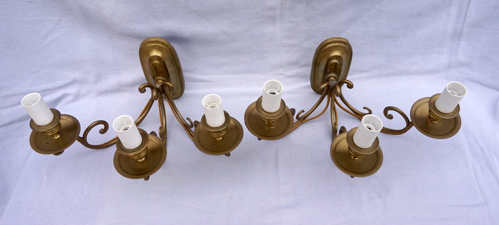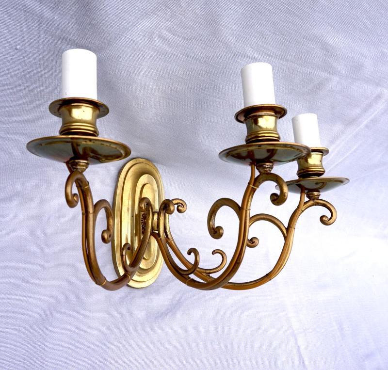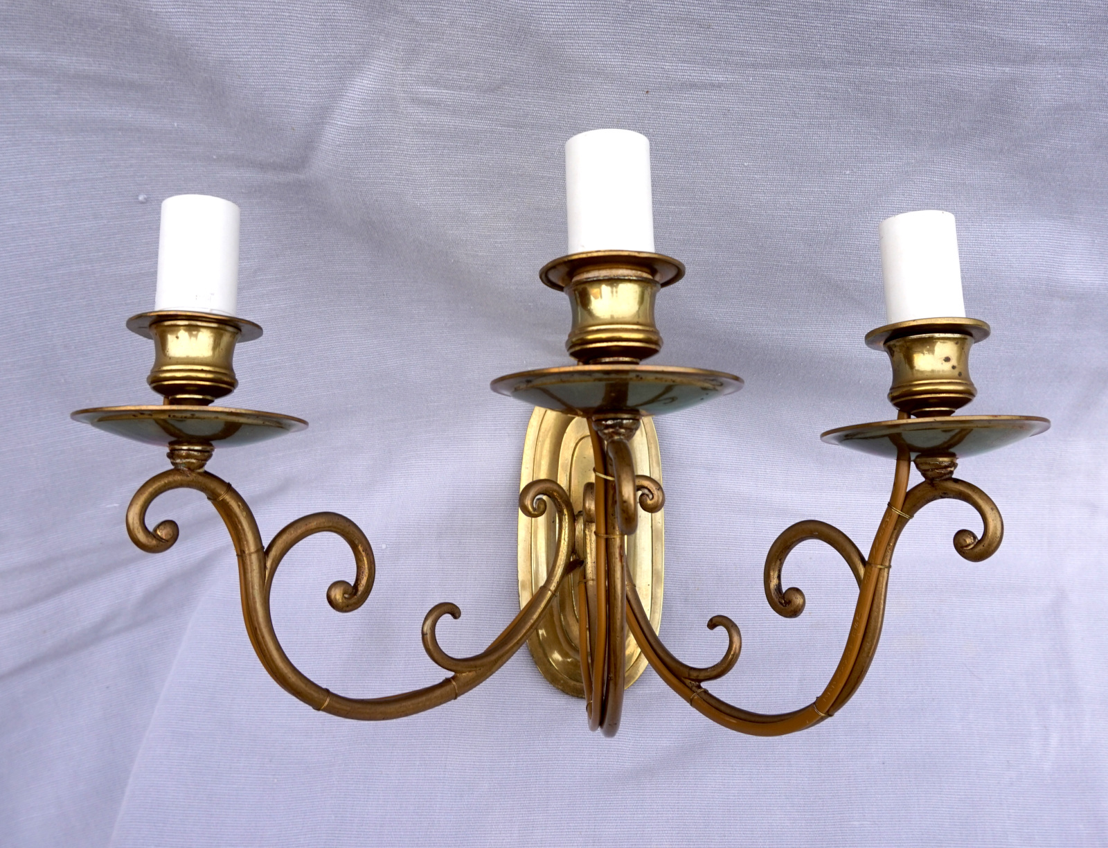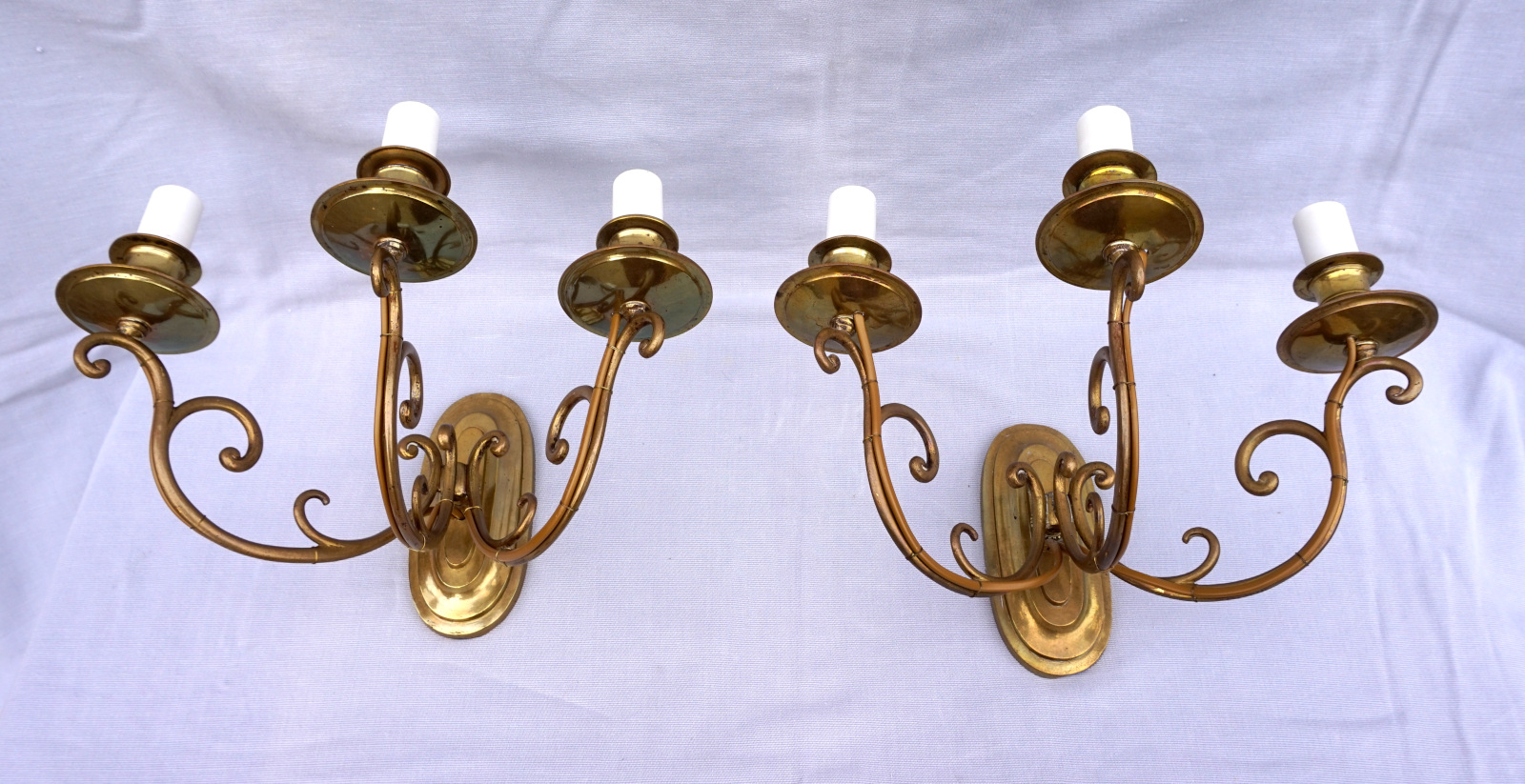 Paire d'appliques murales en laiton doré à 3 lumières de style Directoire, début XX° siècle.  Hauteur 20.2 cm, largeur 31 cm,, profondeur 23.5 cm, poids de la paire 2.240 kg. Très bel état.
