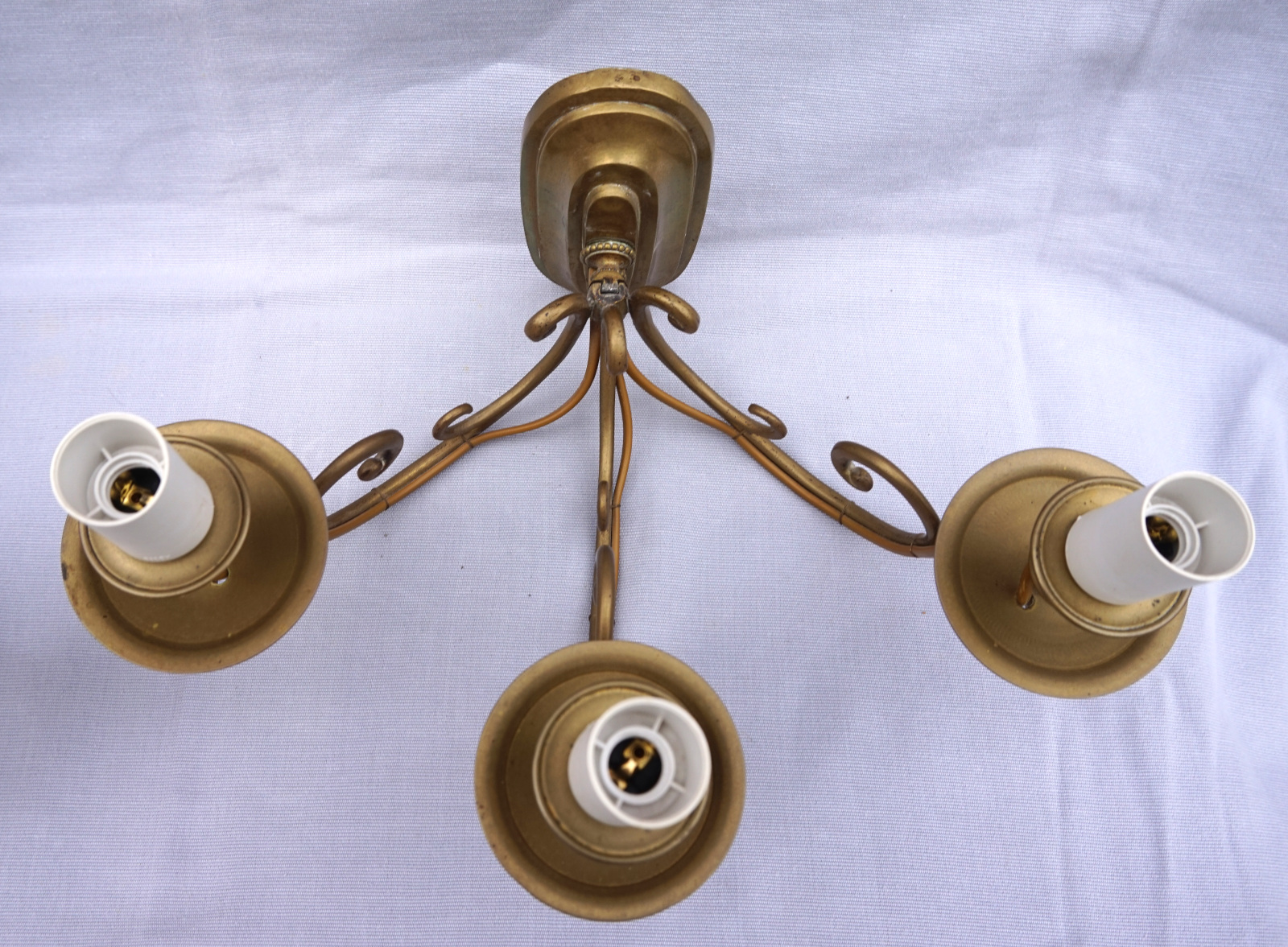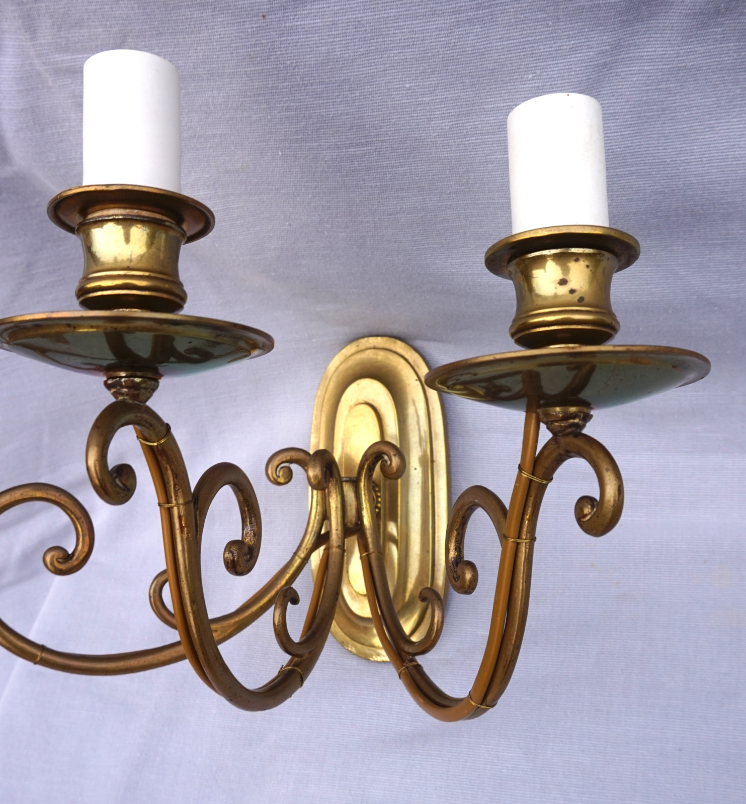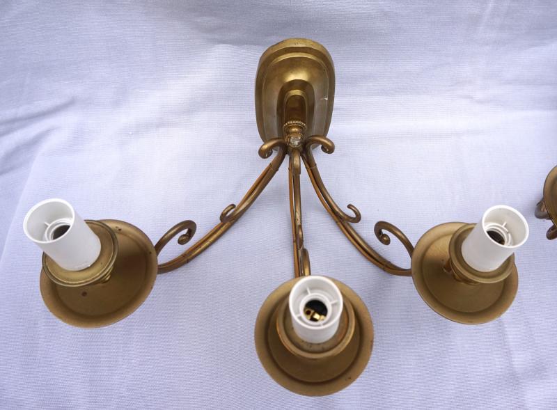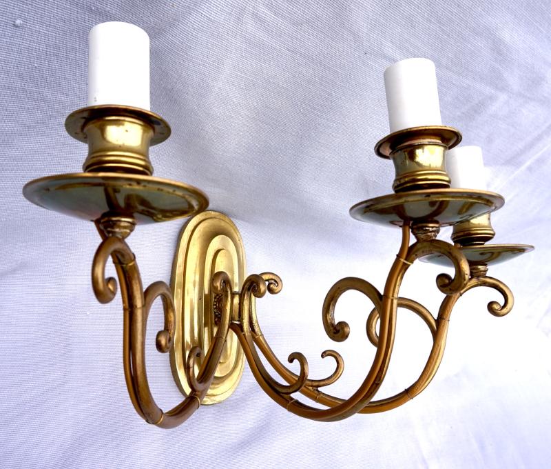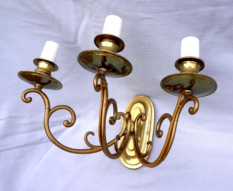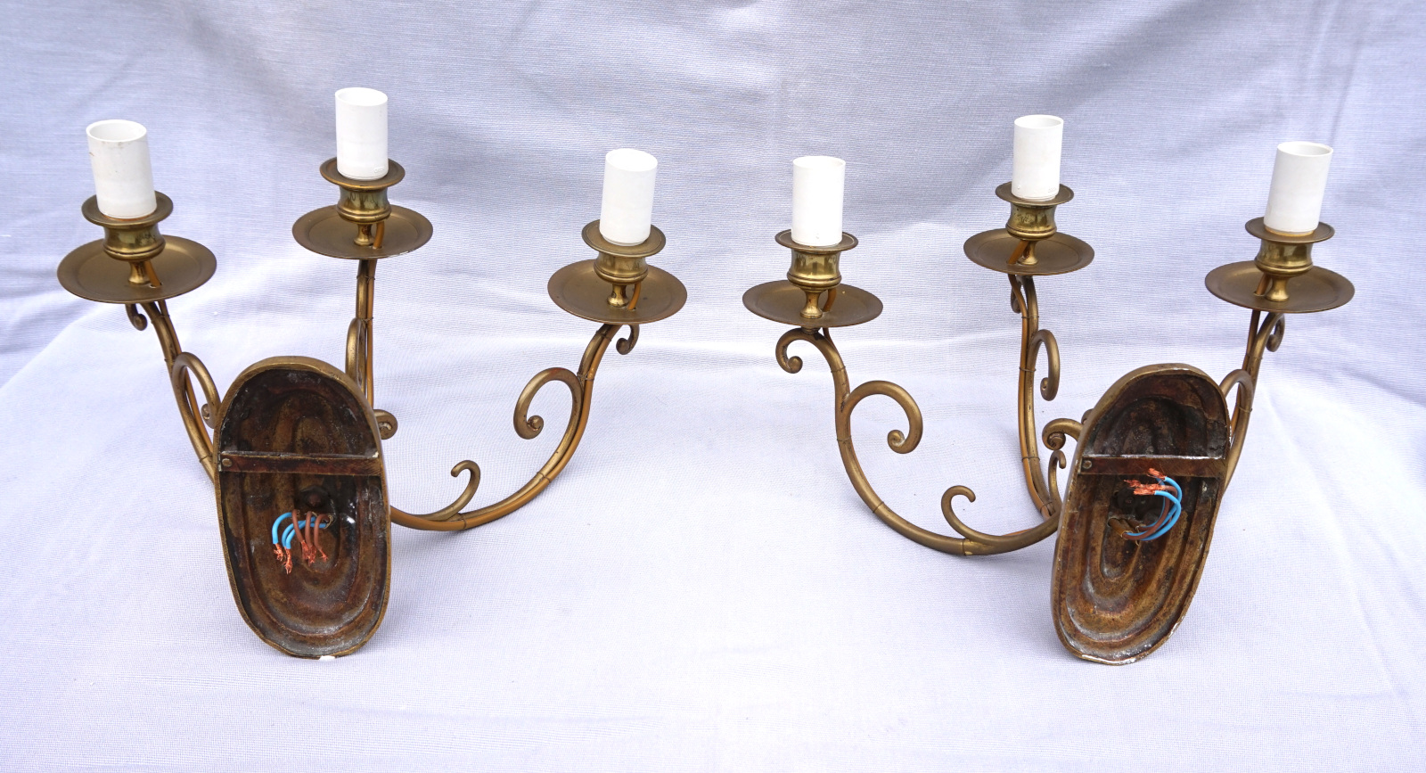 Paire d'appliques murales en laiton doré à 3 lumières de style Directoire, début XX° siècle.  Hauteur 20.2 cm, largeur 31 cm,, profondeur 23.5 cm, poids de la paire 2.240 kg. Très bel état.