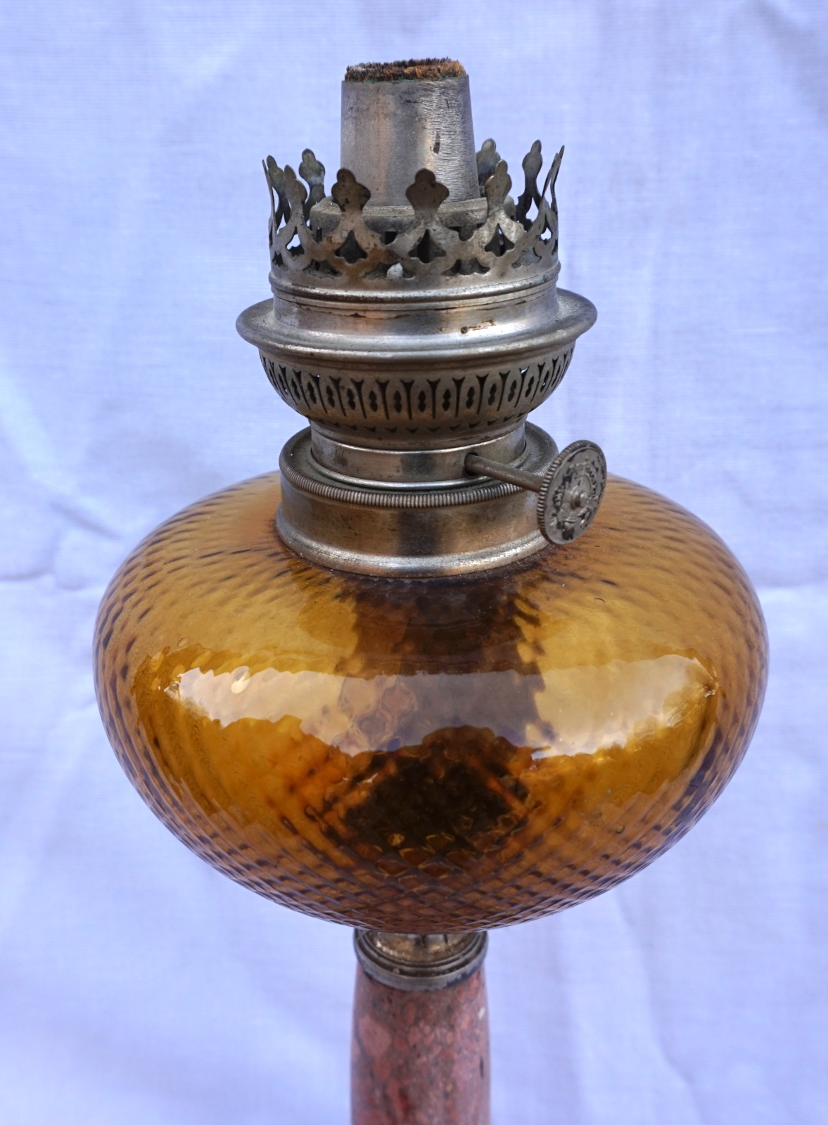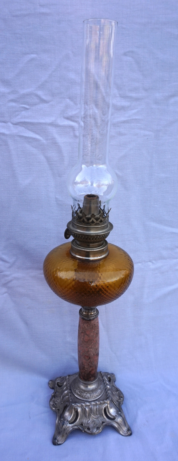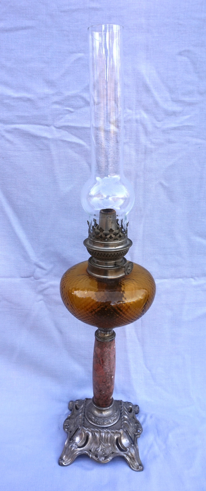 Lampe à pétrole avec un brûleur de Paris sur un réservoir en verre ambré et cotelé, colonne en marbre et base rectangulaire en régule. Hauteur totale 64.7 cm, hauteur du pied 42.5 cm, dimensions de la base 14cm par coté. Parfait état, prêt à l'emploi.