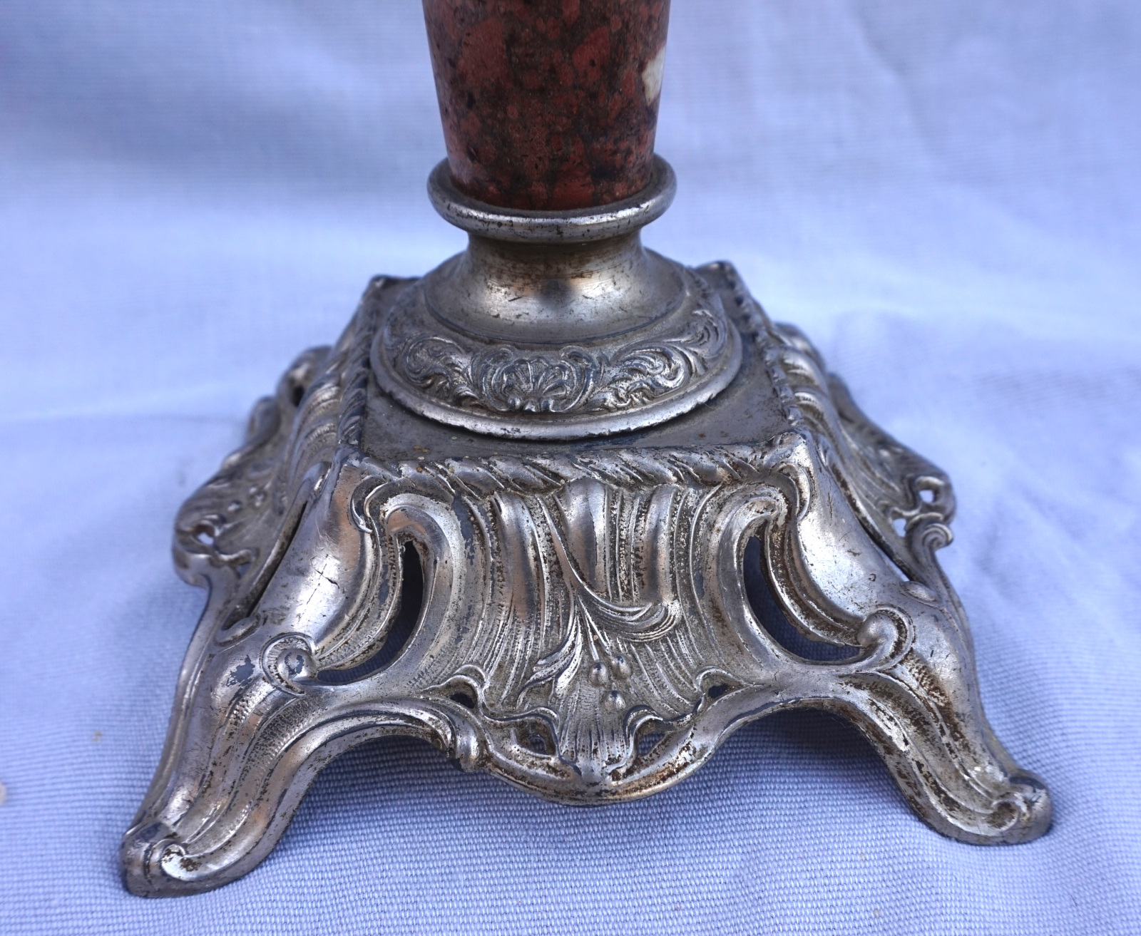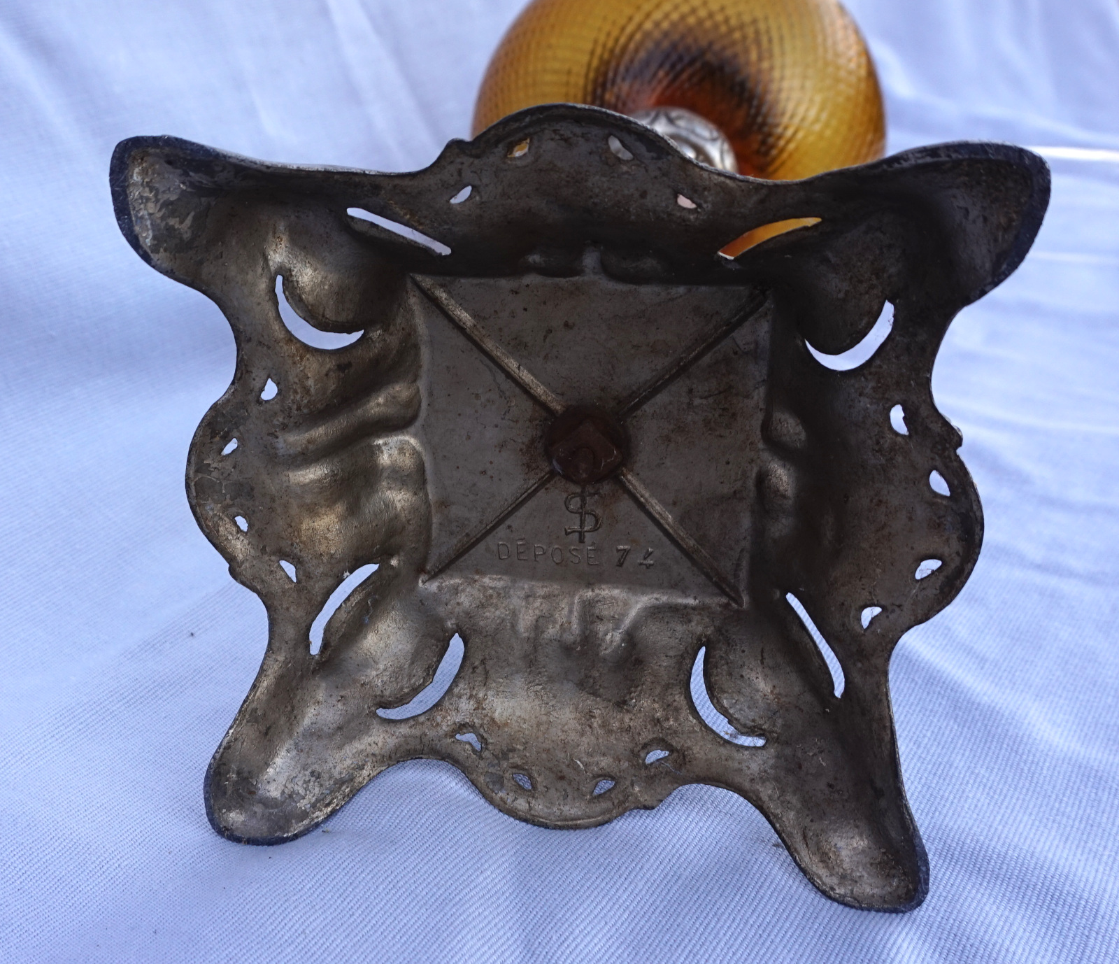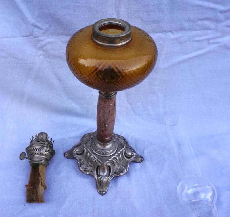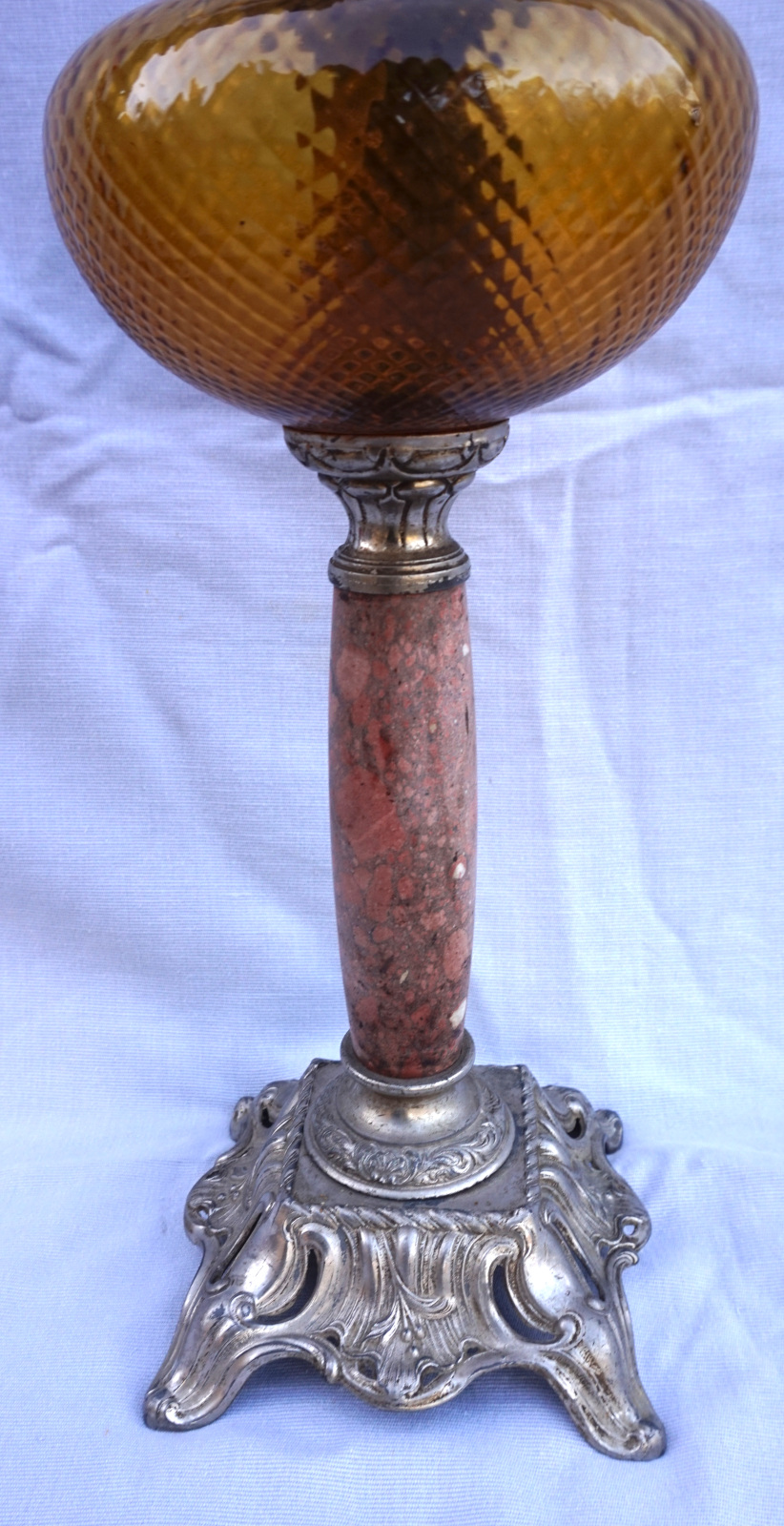French oil kerosene lamp with Paris burner , amber twisted glass bowl and marbre and spelter base made during the 1910's. 25 1/2" (64.7cm) height with chimney, 12 3/4" (42.5cm) height for the lamp, 5 1/2" (14cm) by side for the suare base. Perfect condition and ready for use as shown by the following pictures.