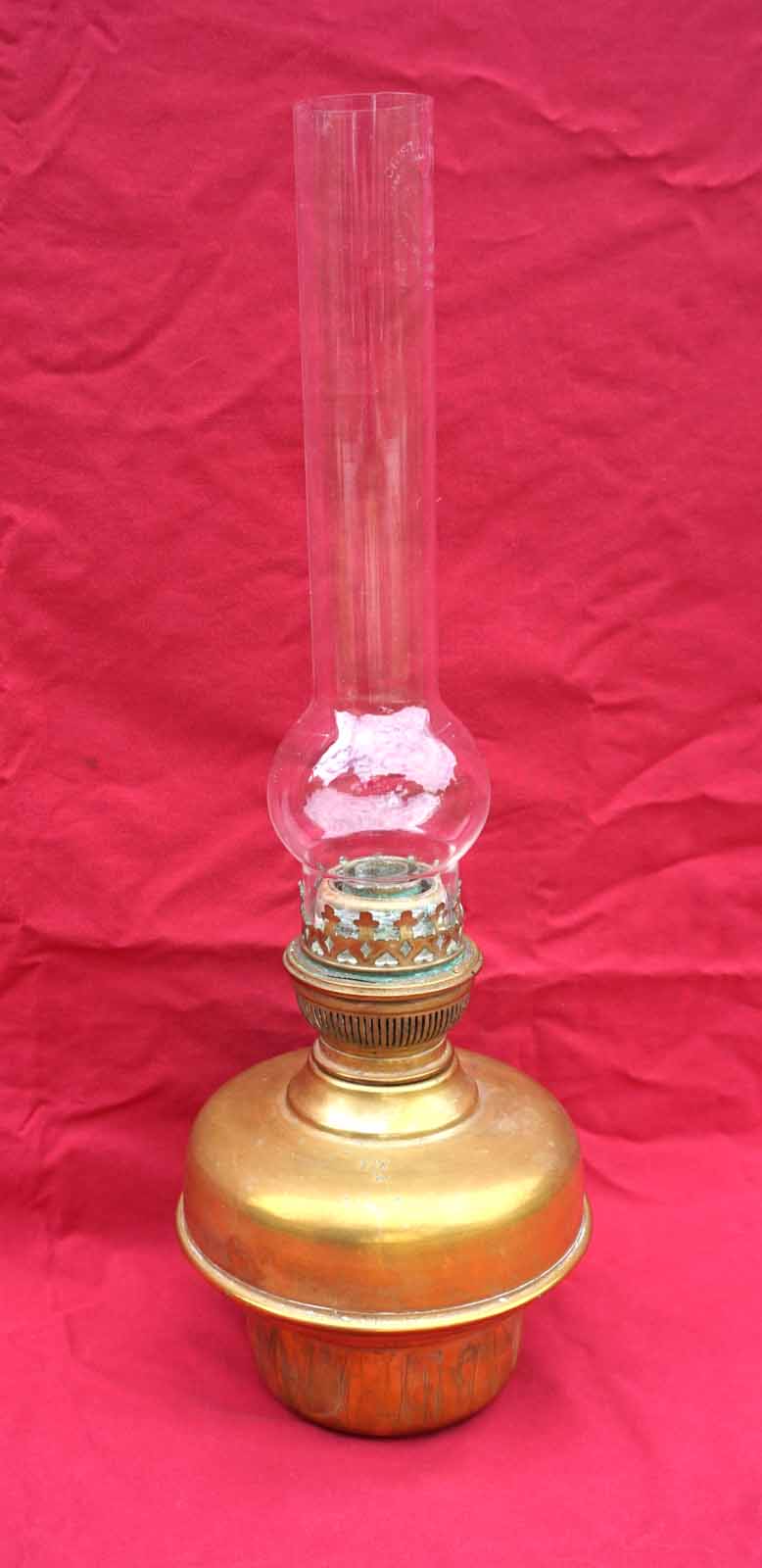 French oil kerosene lamp with brass base and Matador burner with it's original glass chimner made early 1900's. 17 1/4" (44cm) height overall, 7 1/8" (18cm) height for the base, 6" (15.2cm) reservoir diameter, 4" (10.2cm) base diameter. Good condition, a few scratches and bumps on the brass base as shown by the following pictures.