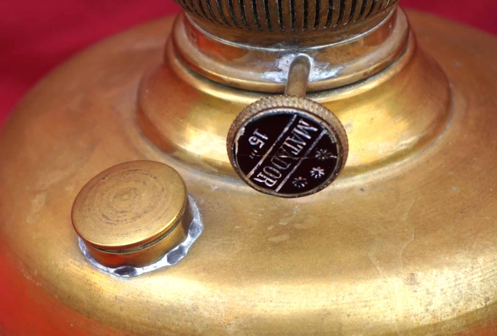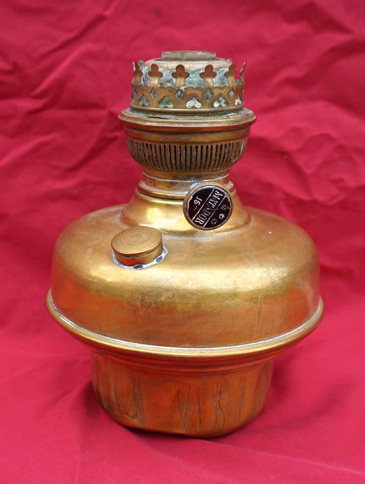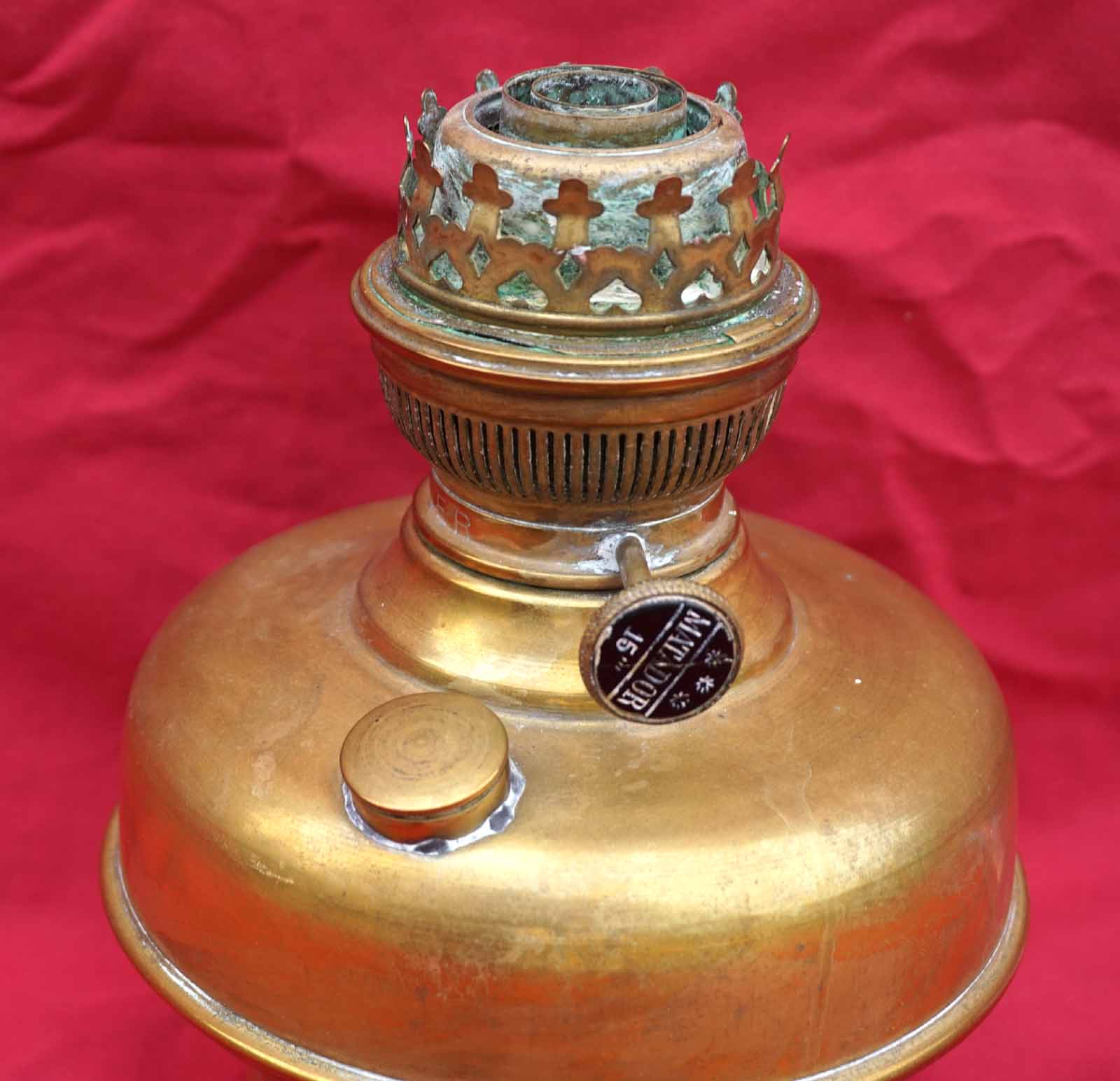 Lampe à pétrole sur un piétement en laiton, équipée d'un bec Matador et son verre d'origine. Hauteur totale 44 cm, hauteur du pied 18 cm, diamètre du pied 15.2 cm, diamètre à la base 10.2 cm. Bel état, la base du pied à quelques griffures et chocs