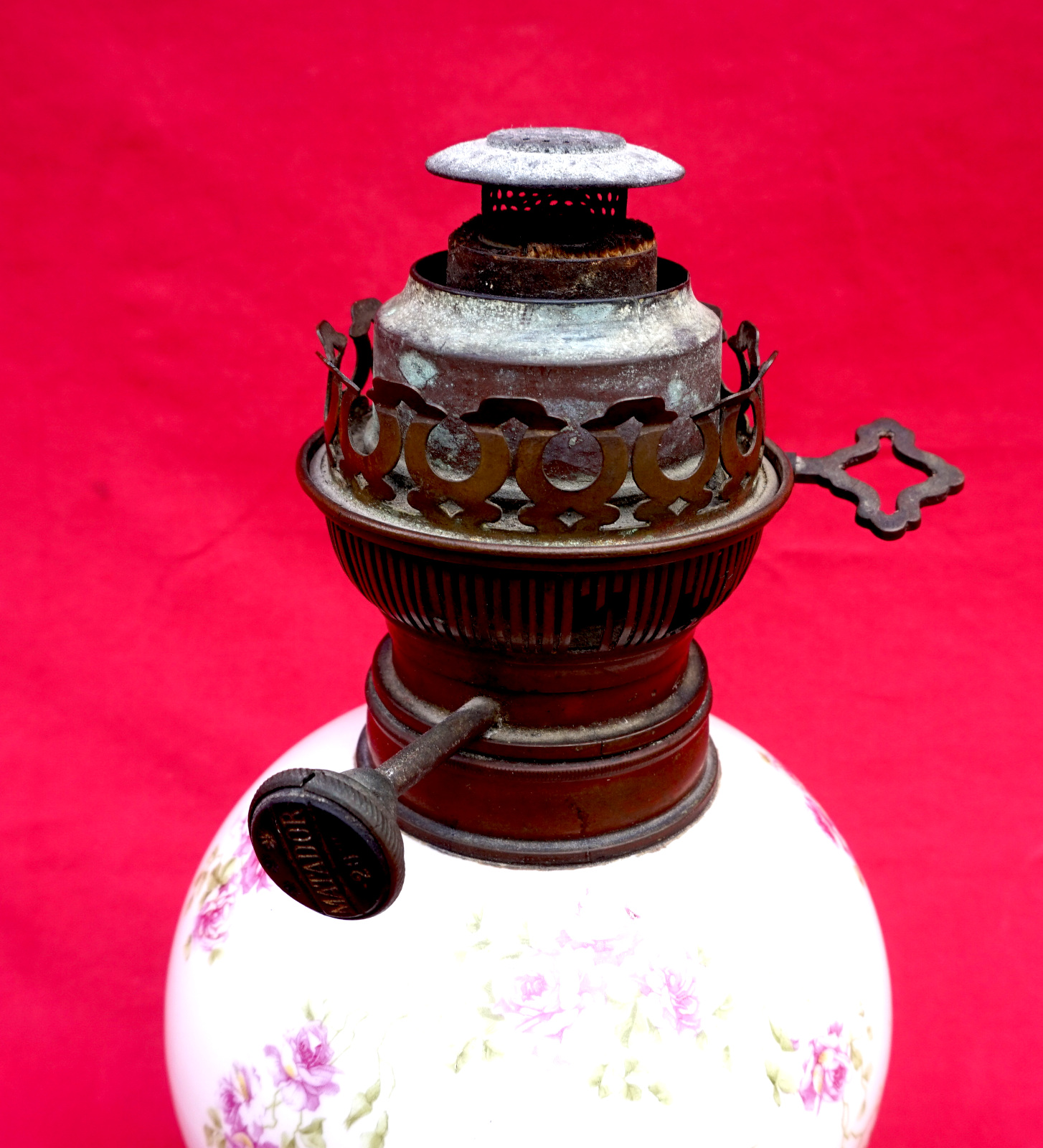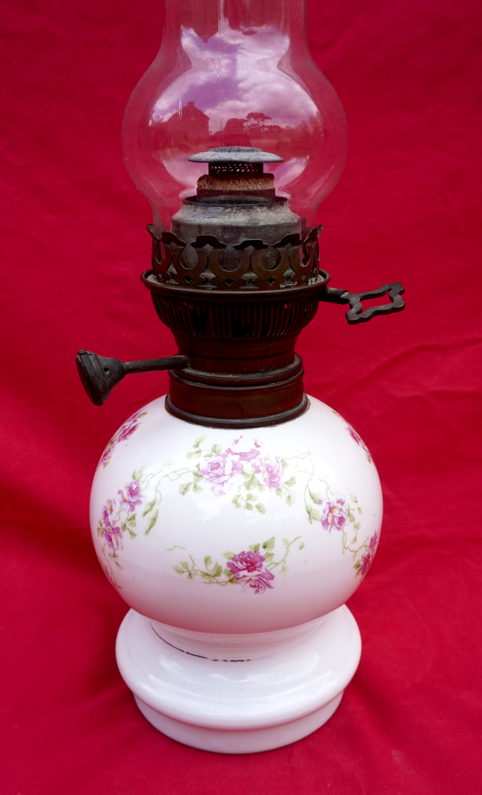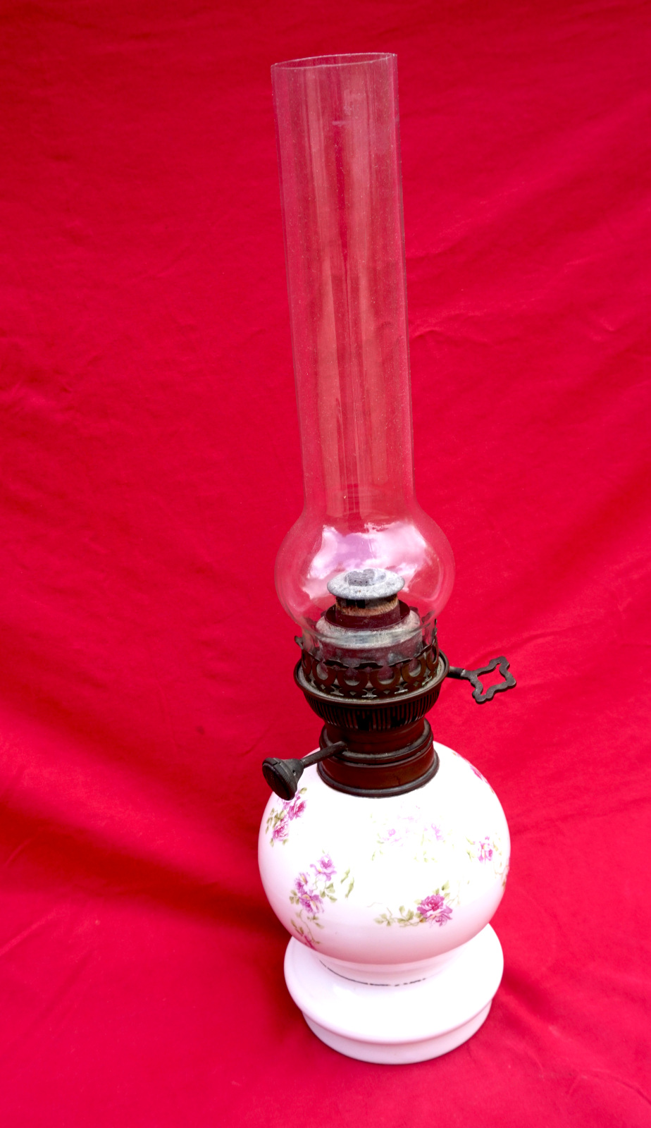 French oil lamp with porcelain base ornate with roses, Matador adjustable burner and chimney made during the 1900's. 19" (48.3cm) total height, 10 1/2" (26.6cm) base height, 5 1/4" (13.5cm) diameter of the base, weight 2lb 9oz (1.171kilogram). Good condition, the knob of the burner move slightly, and ready for use.