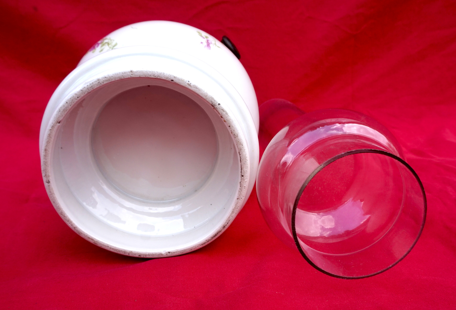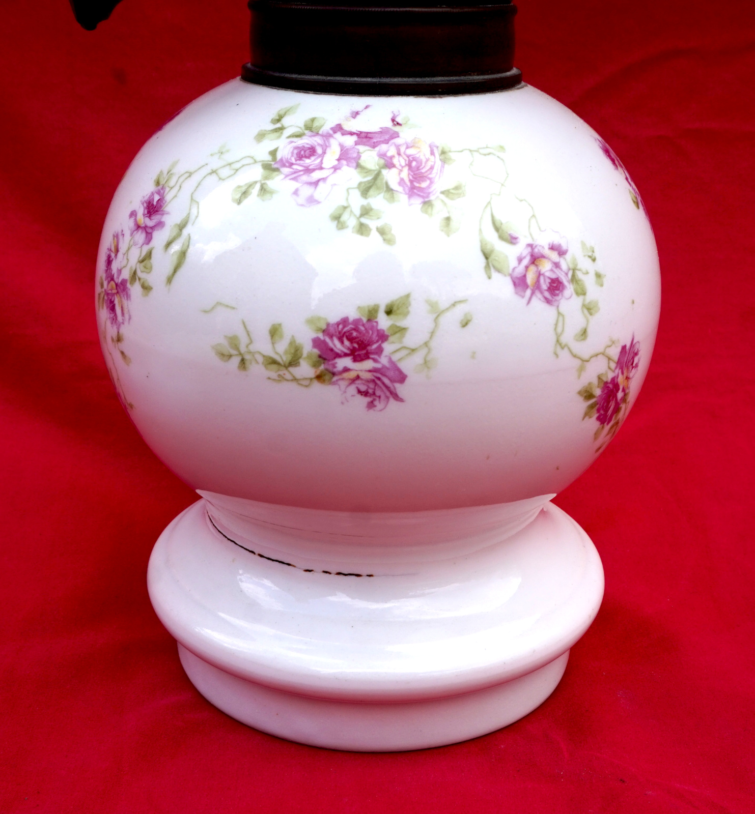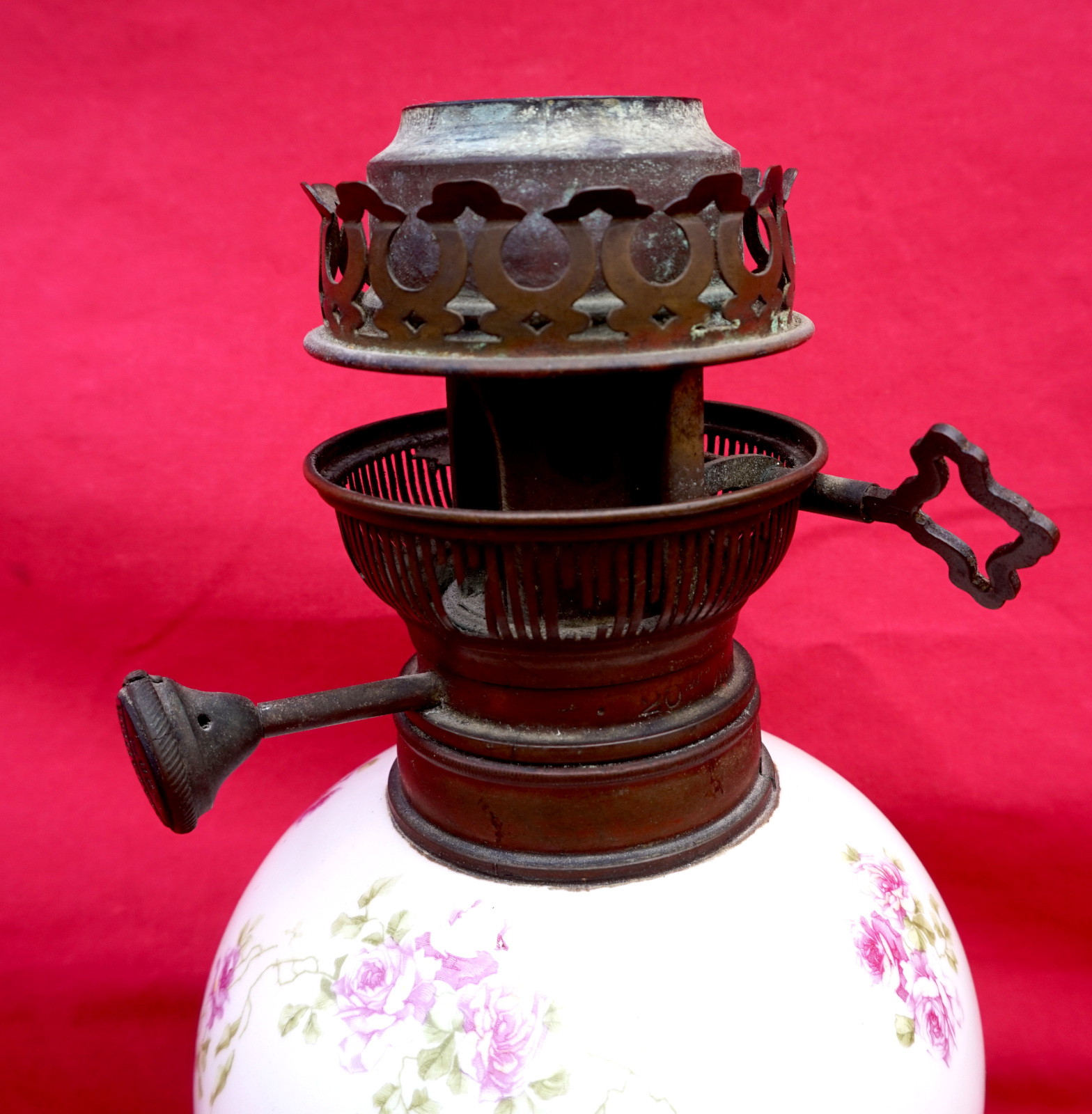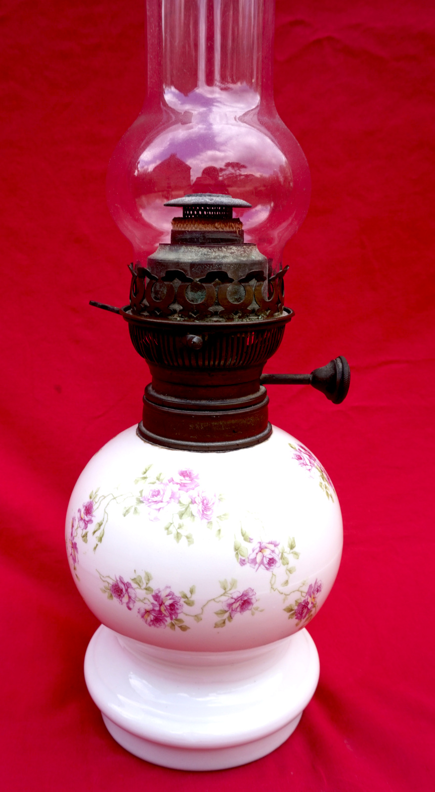 French oil lamp with porcelain base ornate with roses, Matador adjustable burner and chimney made during the 1900's. 19" (48.3cm) total height, 10 1/2" (26.6cm) base height, 5 1/4" (13.5cm) diameter of the base, weight 2lb 9oz (1.171kilogram). Good condition, the knob of the burner move slightly, and ready for use.