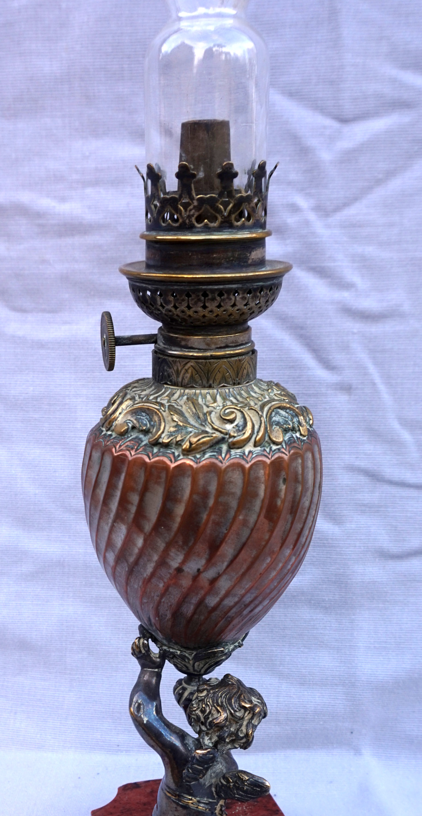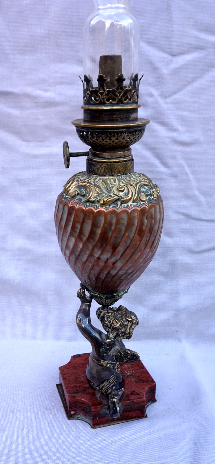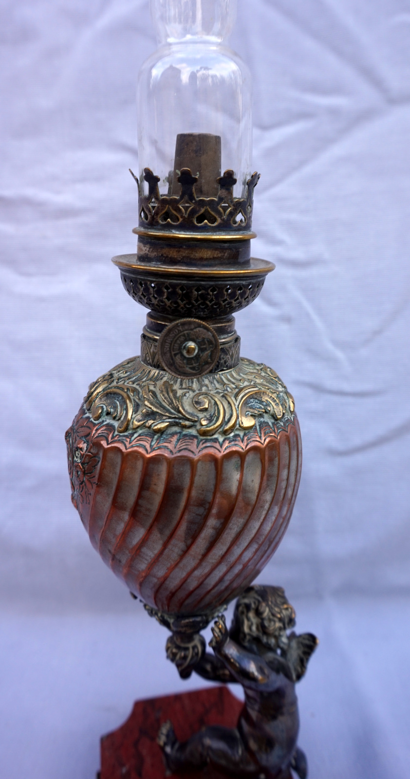 Lampe à pétrole, un amour en bronze agrenté supportant une torchère en cuivre et laiton , bruleur Wild & Wessel, vers 1865. La molette du bruleur est signé W & W Kosmos. Hauteur totale 49.5 cm, hauteur de la lampe 28 cm, pour le pied 8.3 cm par côté. Bel état, le réservoir est légèrement incliné vers l'arrière.