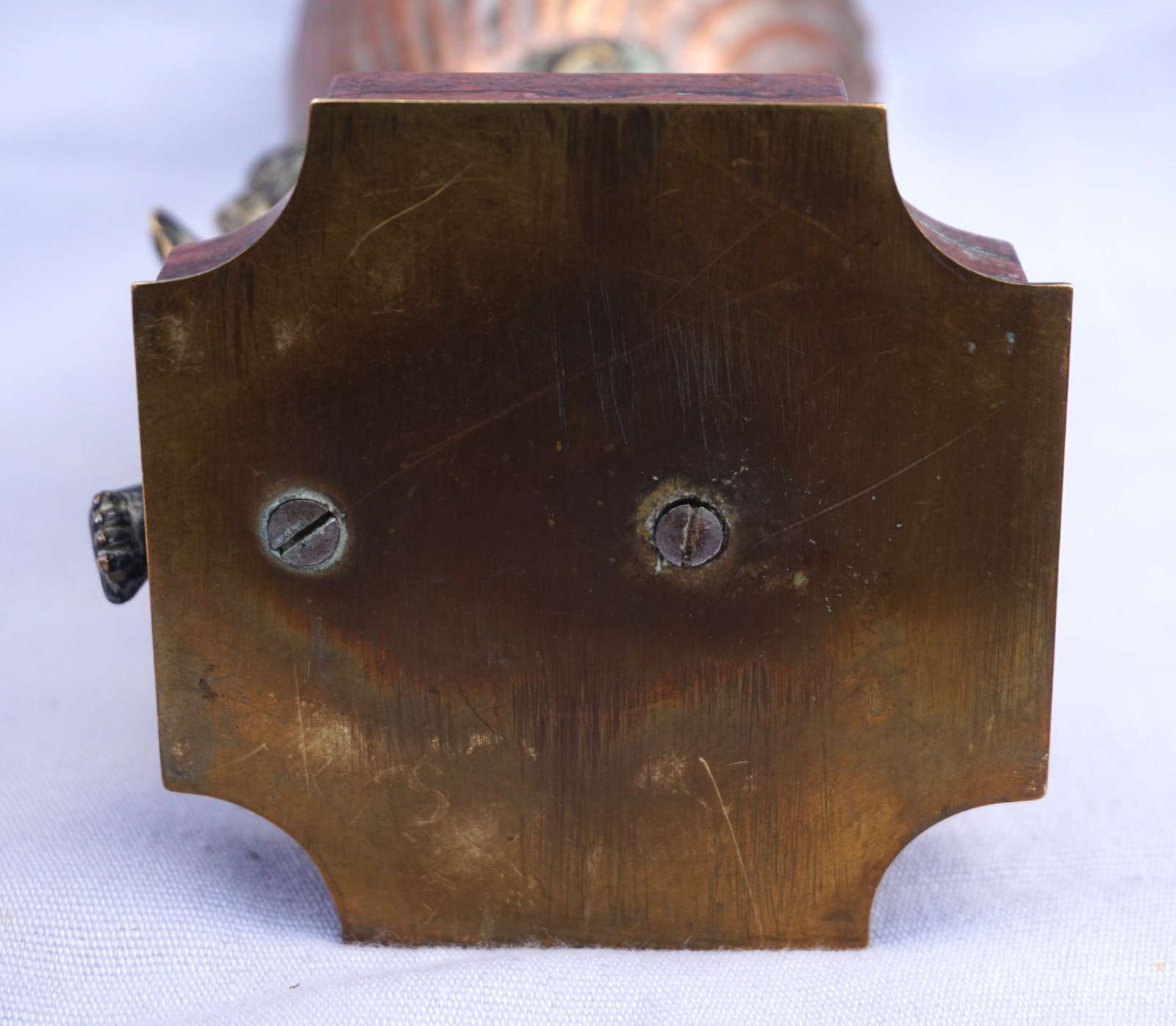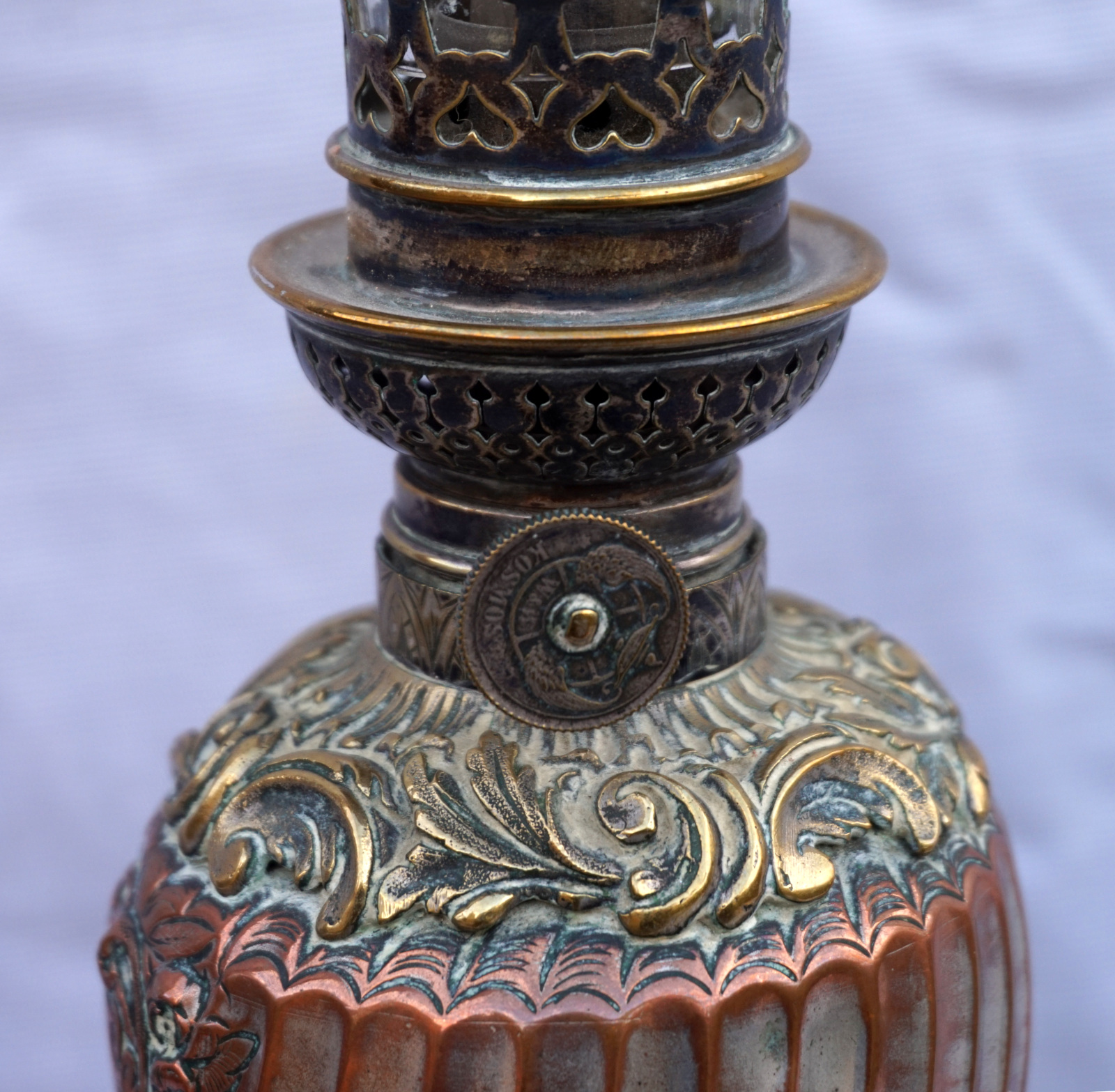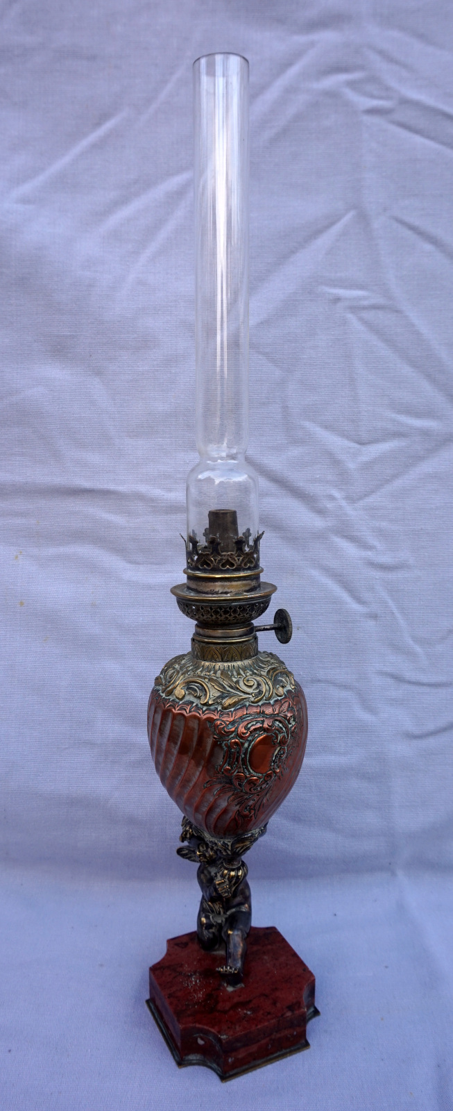 Lampe à pétrole, un amour en bronze agrenté supportant une torchère en cuivre et laiton , bruleur Wild & Wessel, vers 1865. La molette du bruleur est signé W & W Kosmos. Hauteur totale 49.5 cm, hauteur de la lampe 28 cm, pour le pied 8.3 cm par côté. Bel état, le réservoir est légèrement incliné vers l'arrière.
