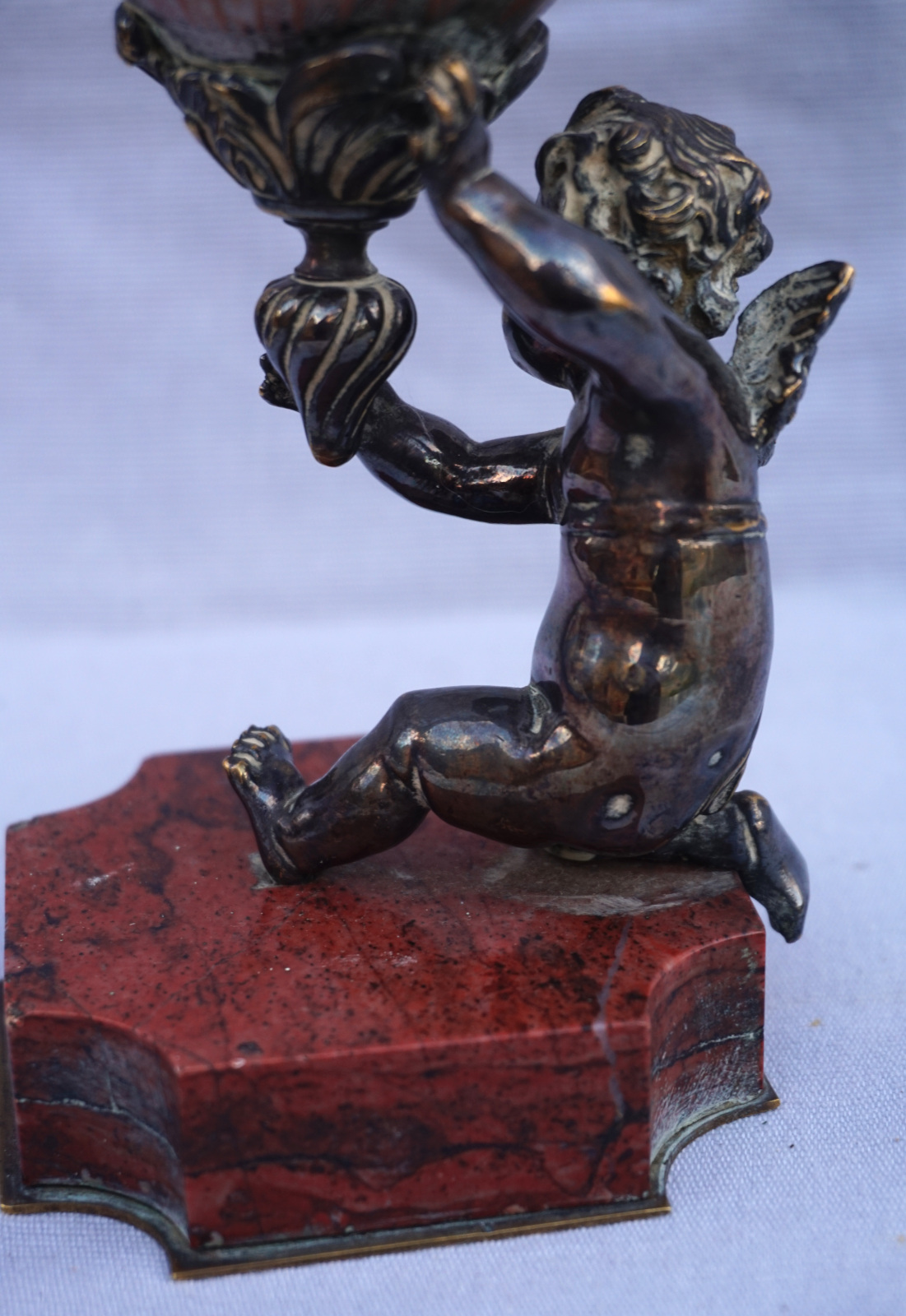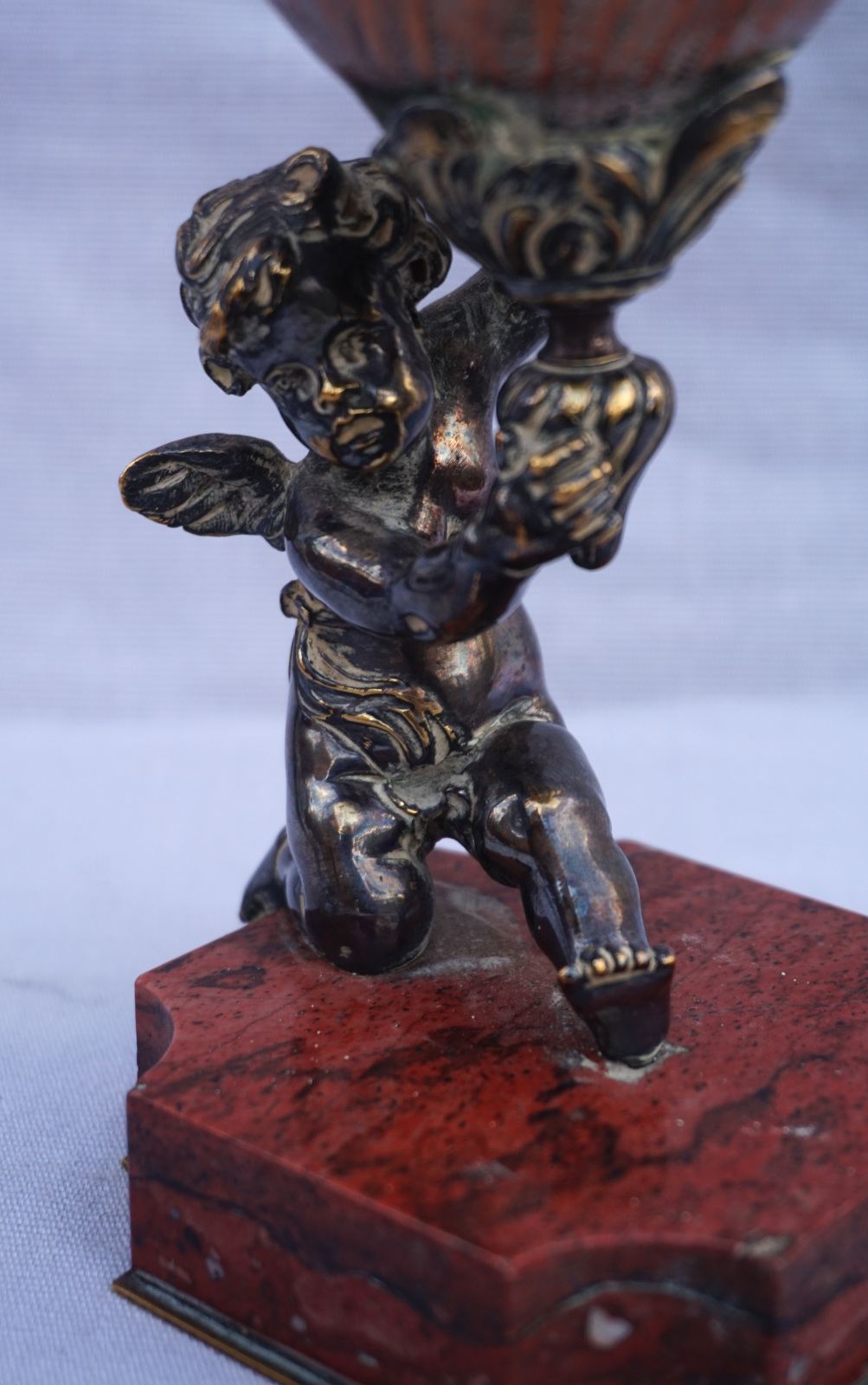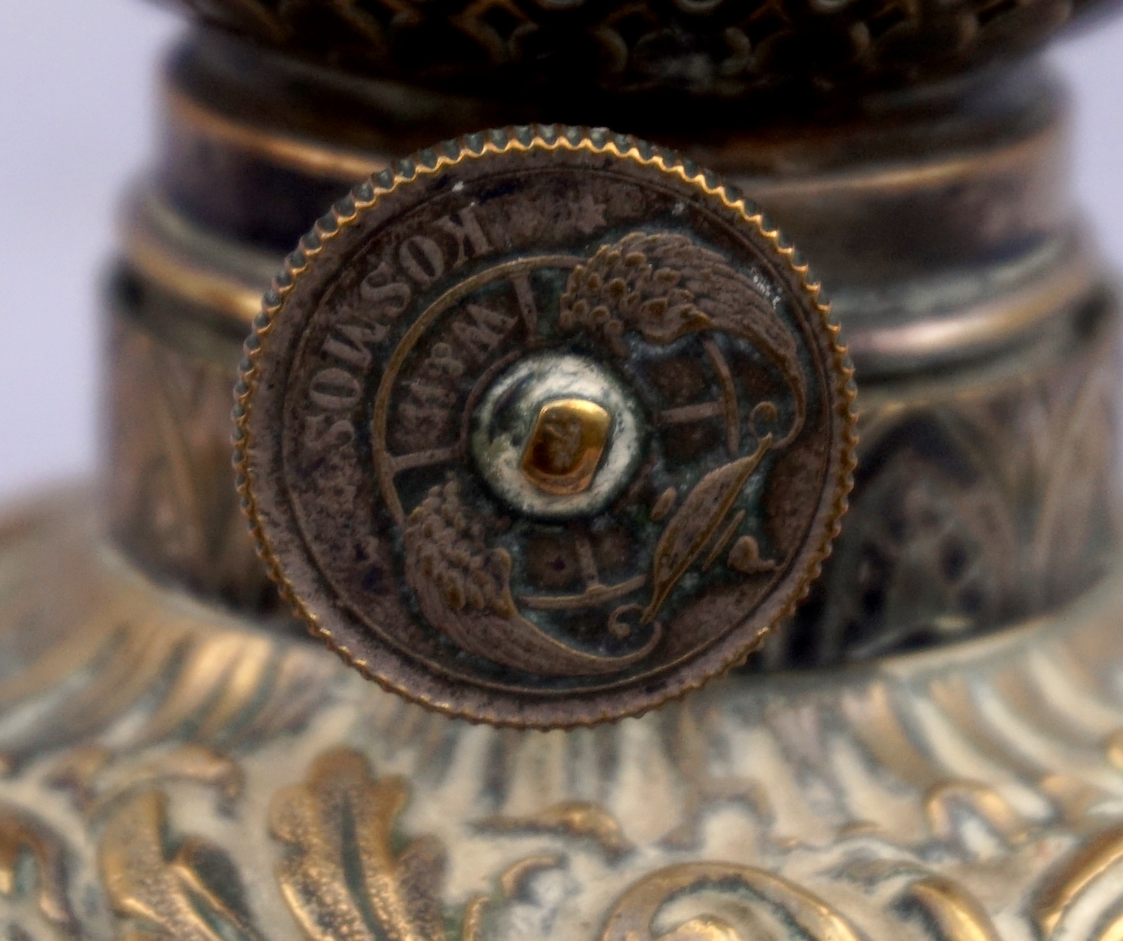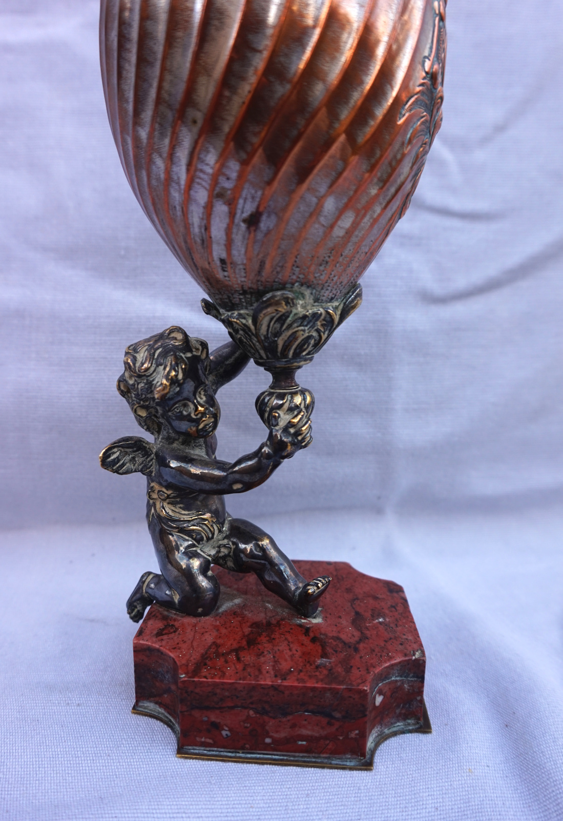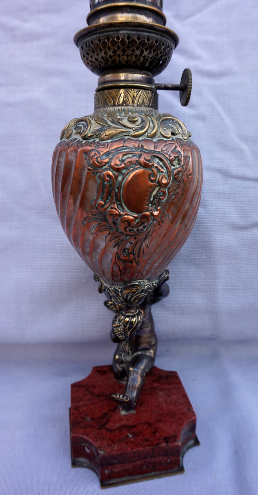 French oil lamp with silver plate cherub on marble base holding scalloped and engraved copper and brass bowl with Will & Wessel KOSMOS burner made during the 1865's. 19 1/2" (49.5cm) total height with chimney, 11" (28cm) base height, 3 1/4" (8.3cm) by side to the base, weight 2lbs 8oz (1.159 kilograms). Good condition, it leans slightly backwards as shown by the following pictures.