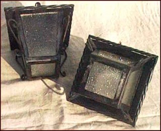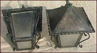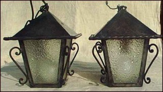 This pair of wrought iron and granite glass lantern has been made around 1940. Good condition. 10"1/2 tall, 7"7/8 width.