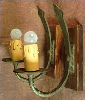 Pair of wall light sconces in wrought iron on chesnut made in France around 1970. Good condition fully restored and rewired and ready to mount on your wall. 12"1/2 tall 9"1/2 deep.