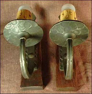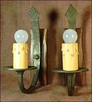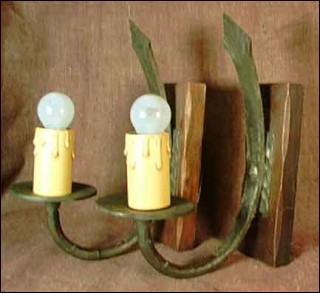 Paire d'appliques en fer battu sur bois de châtaigner, vers 1970. Elles sont à une lumière, en bon état et électrifiées pour le standard américain. Hauteur 32 cm, profondeur 25 cm.