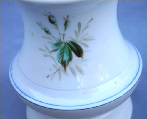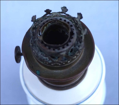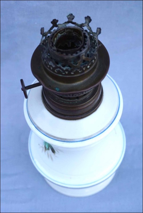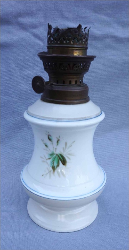French oil kerosene lamp with hand painted Paris porcelain foot made during the end of the 19th century. 8 7/8" (22.5cm) height, 4 1/2" (11.5cm) diameter to the body. Good condition for the foot, the kerosene burner needs to be replace as shown by the following pictures.