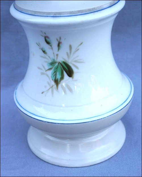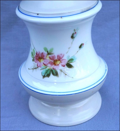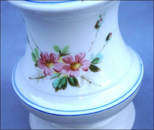 Lampe à pétrole sur un pied en porcelaine de Paris peint à la main de roses, fin XIX° siècle. Hauteur 22,5 cm, diamètre au corps 11,5 cm. Très bel état pour le pied, le bruleur est à changer.