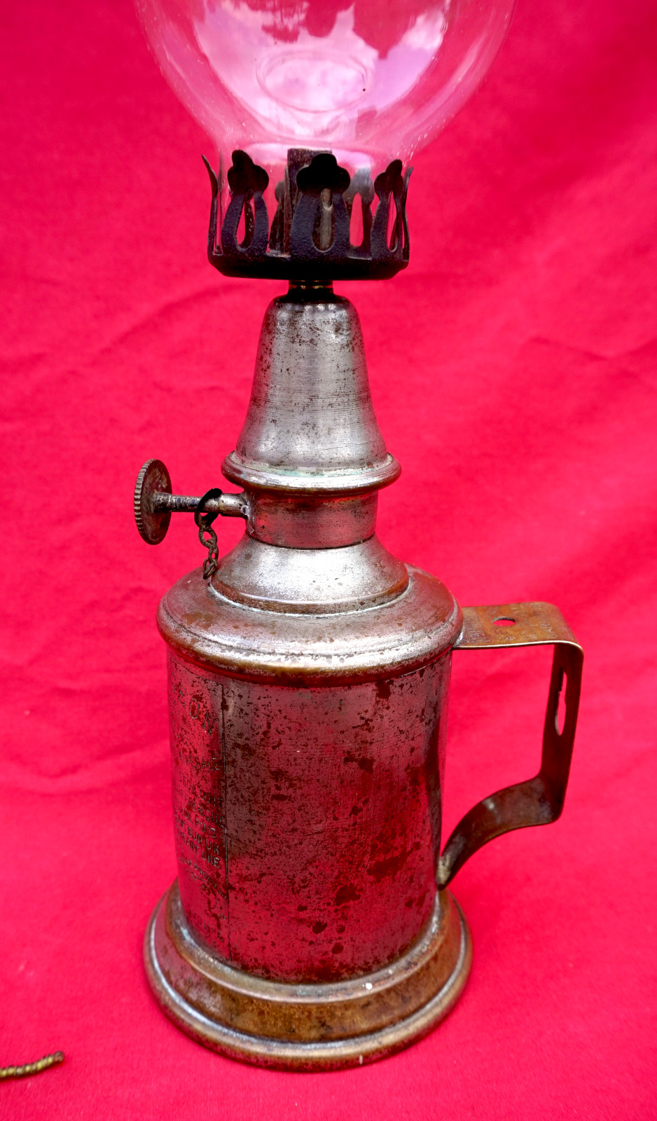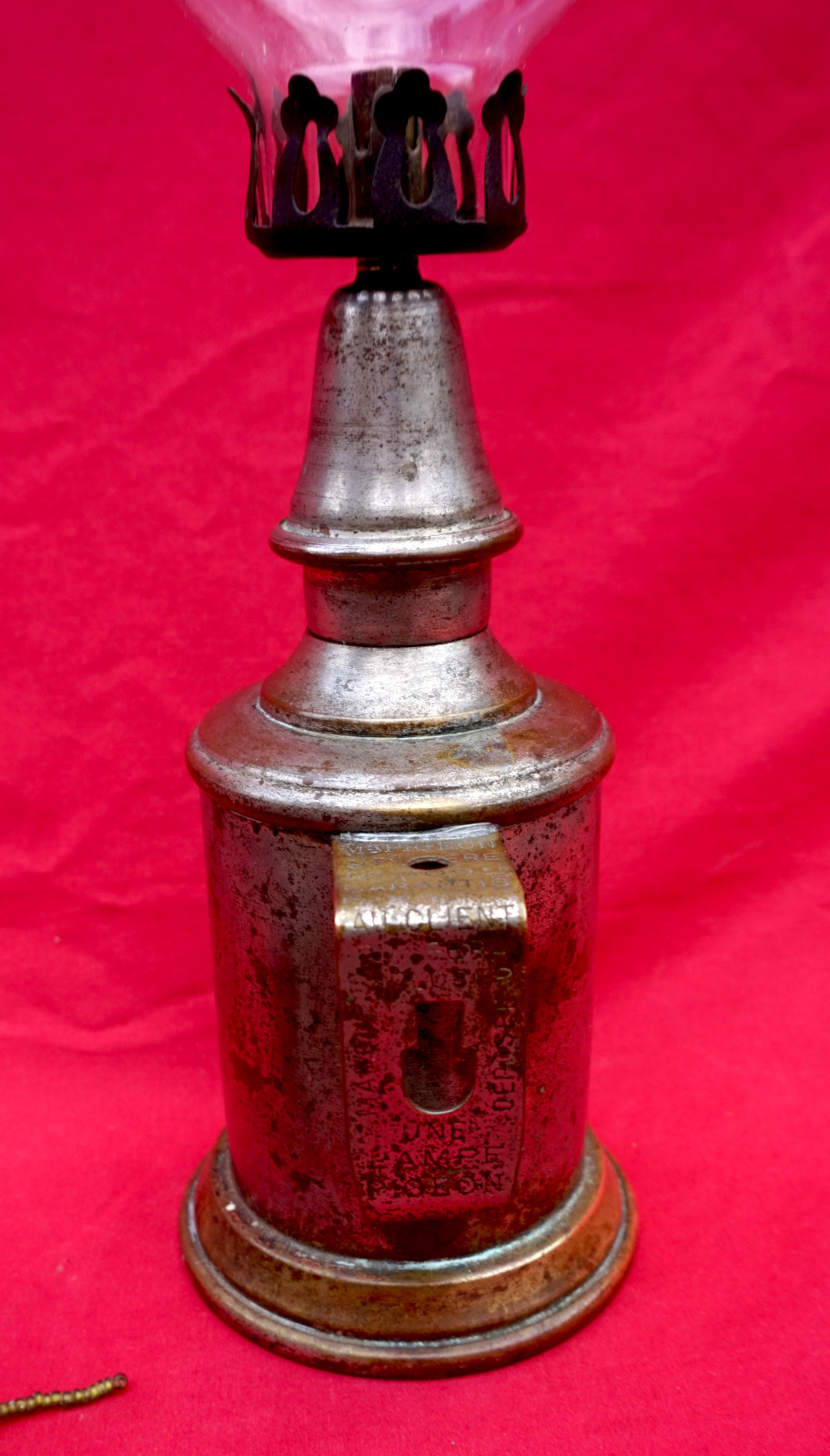 French oil lamp with shade in chromium plated brass model Hirondelle, swallow, made by Pigeon during the 1900's. 9 1/4" (23.5cm) height, 3 1/2" (9cm) width with handle, weight 10oz (302 grams). Beautiful condition complete.