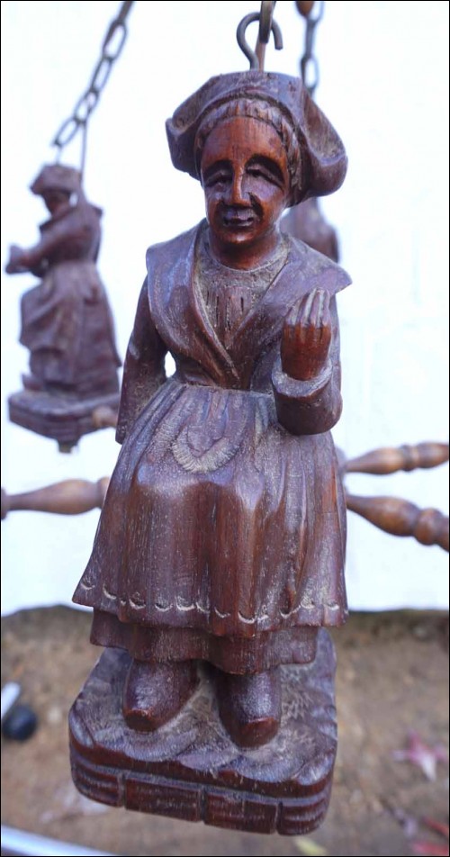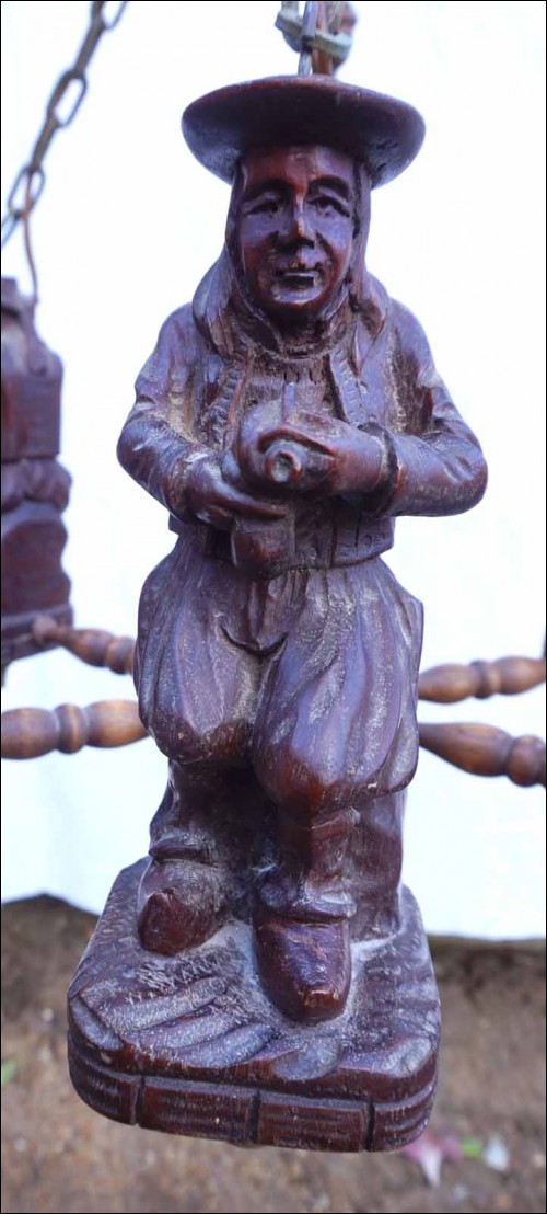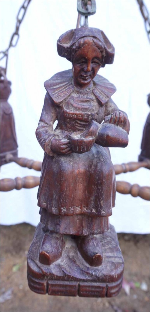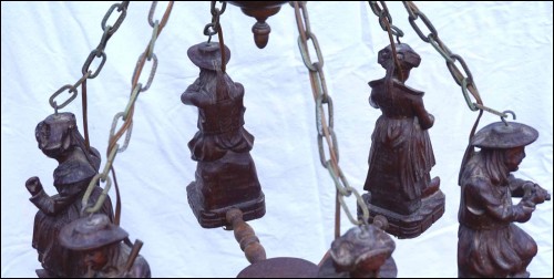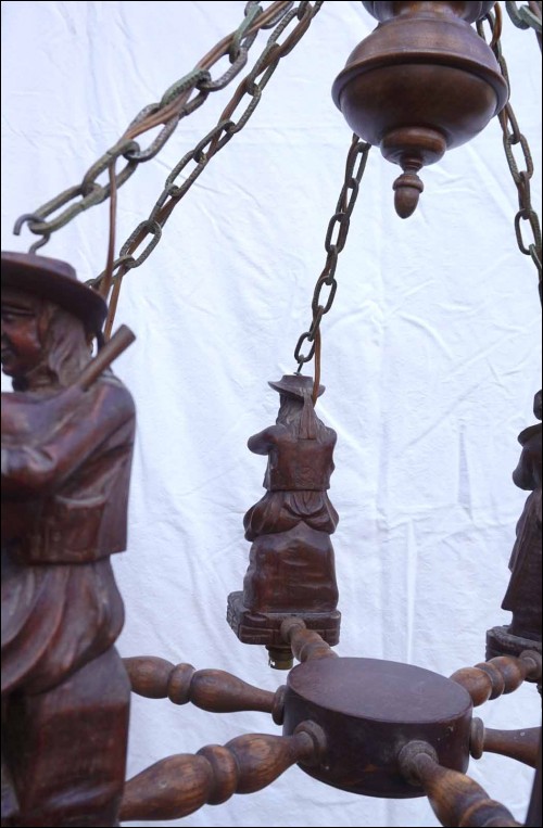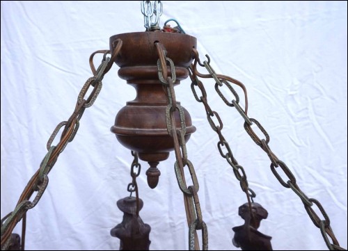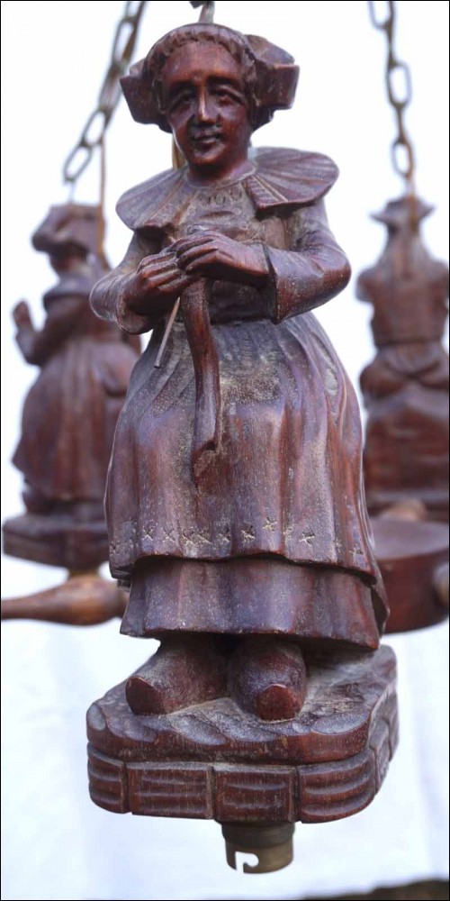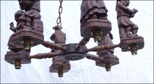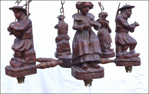 Lustre breton à 6 lumières en bois sculpté, 2 sonneurs, 1 fumeur et 3 femmes à l'ouvrage, vers 1960. Bel état, manque l'ouvrage d'une dame, électrification à refaire. Les personnages sont plus anciens. Hauteur 54 cm, diamètre 60.5 cm.