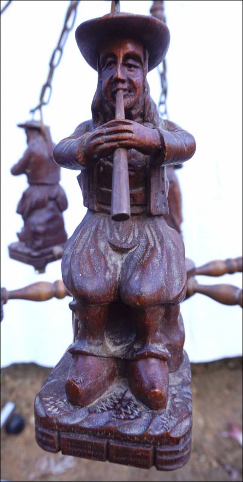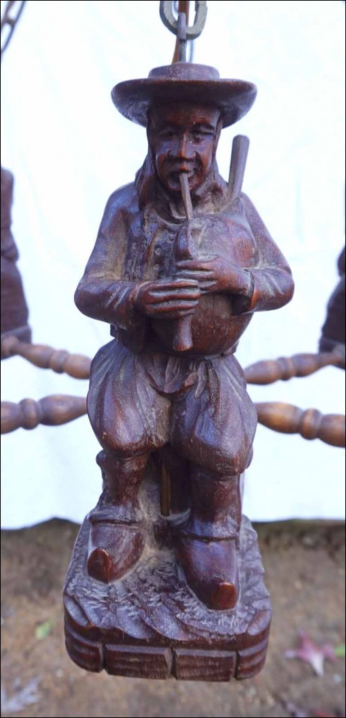 French cut carved wood chandelier with 6 light showing 3 couple of Bretons included 2 musicians made bear Quimper during the mid-century. 23 3/4" (60.5cm) diameter, 21 1/4" (54cm) height. Beautiful condition, it needs to be re-wired to the US standard electric as shown by the following pictures.