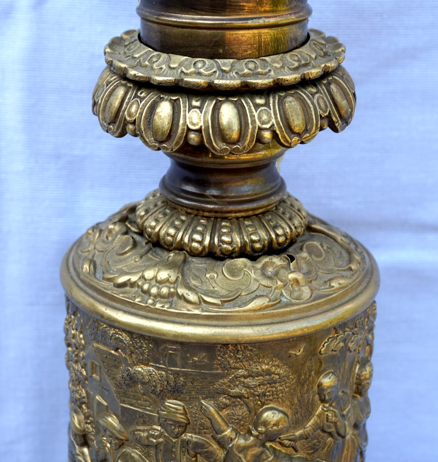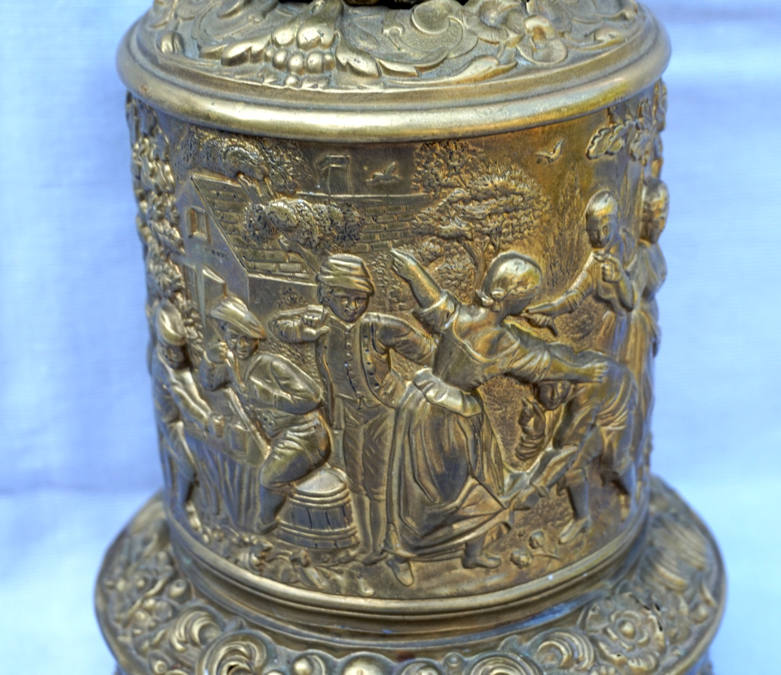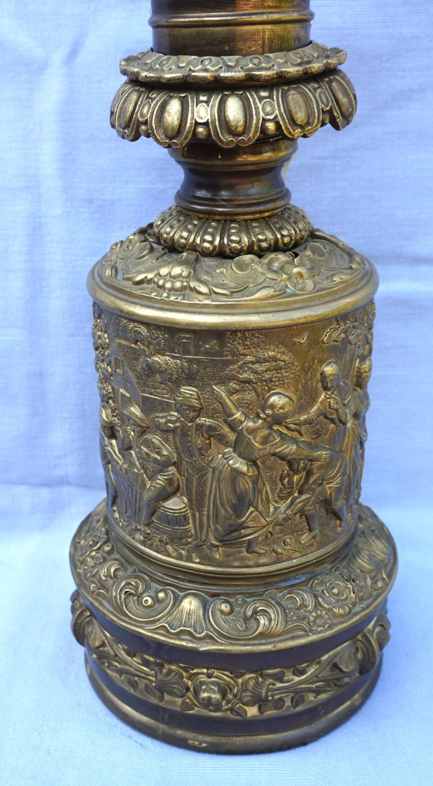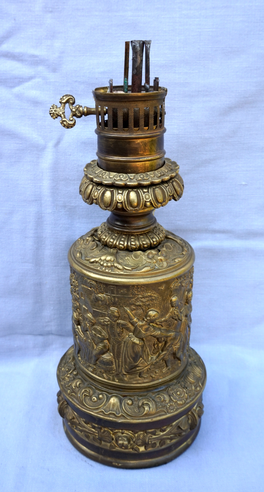 German repousse brass oil lamp showing villagers in front of the tavern made during the 1880's. 12 1/4" (31.5cm) height from the base to the top without burner, 5 " (12.7cm) diameter to the base,weight 1.786 kilogram. It needs repair and reassembly
