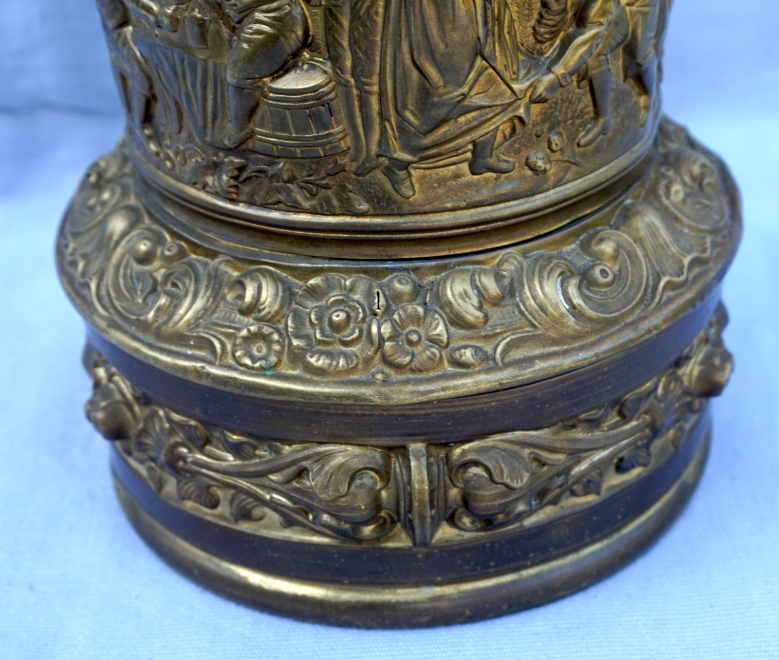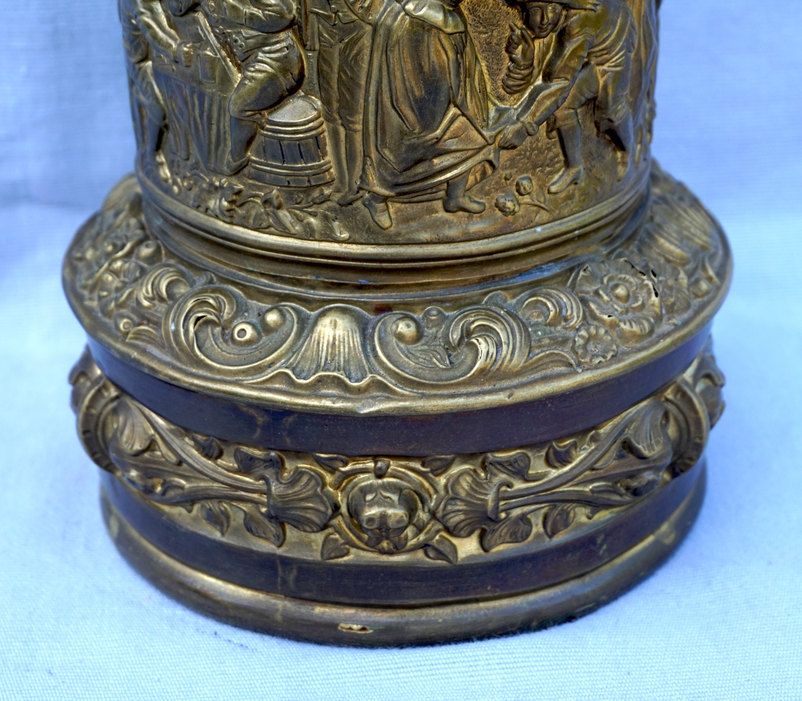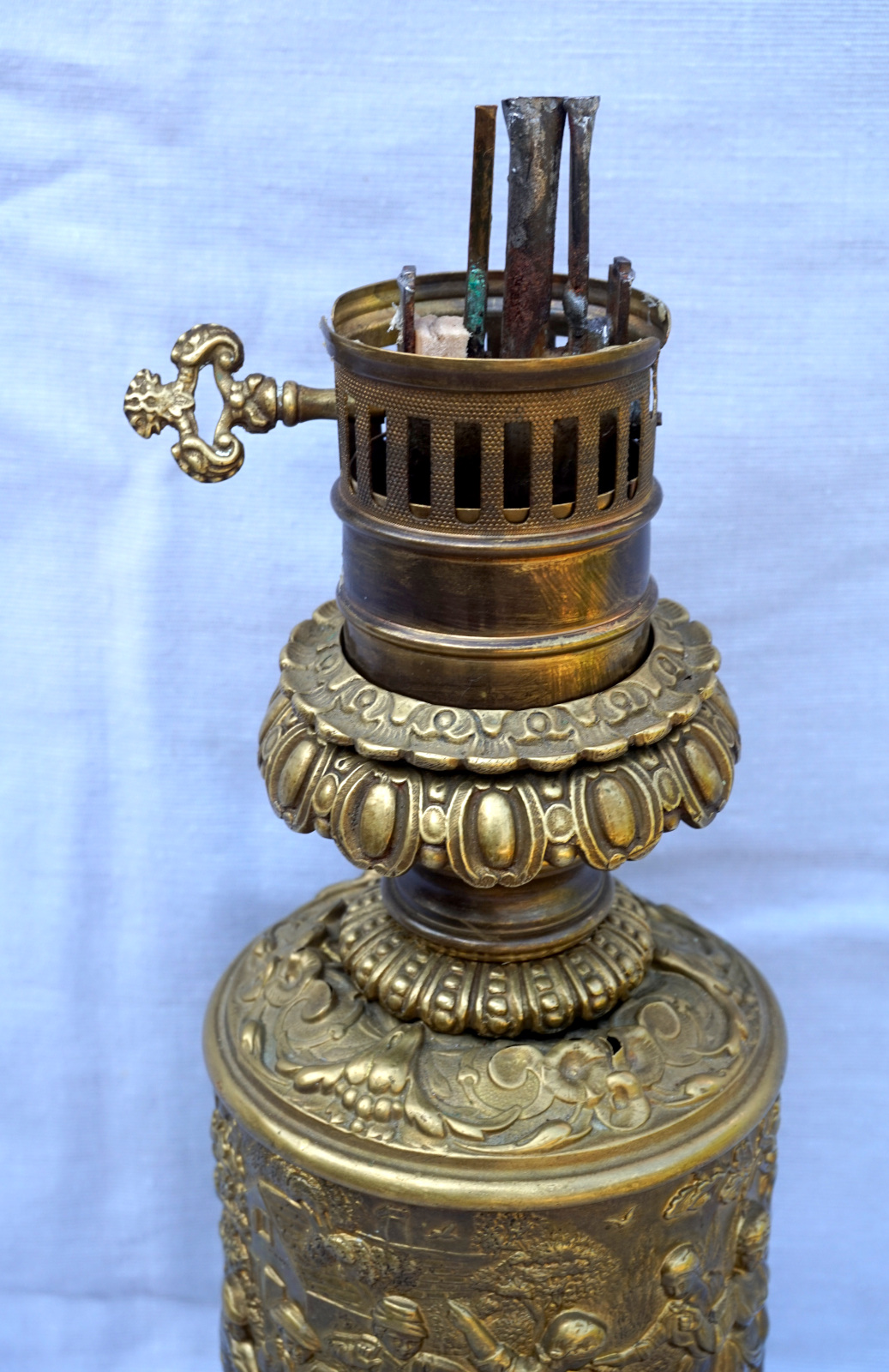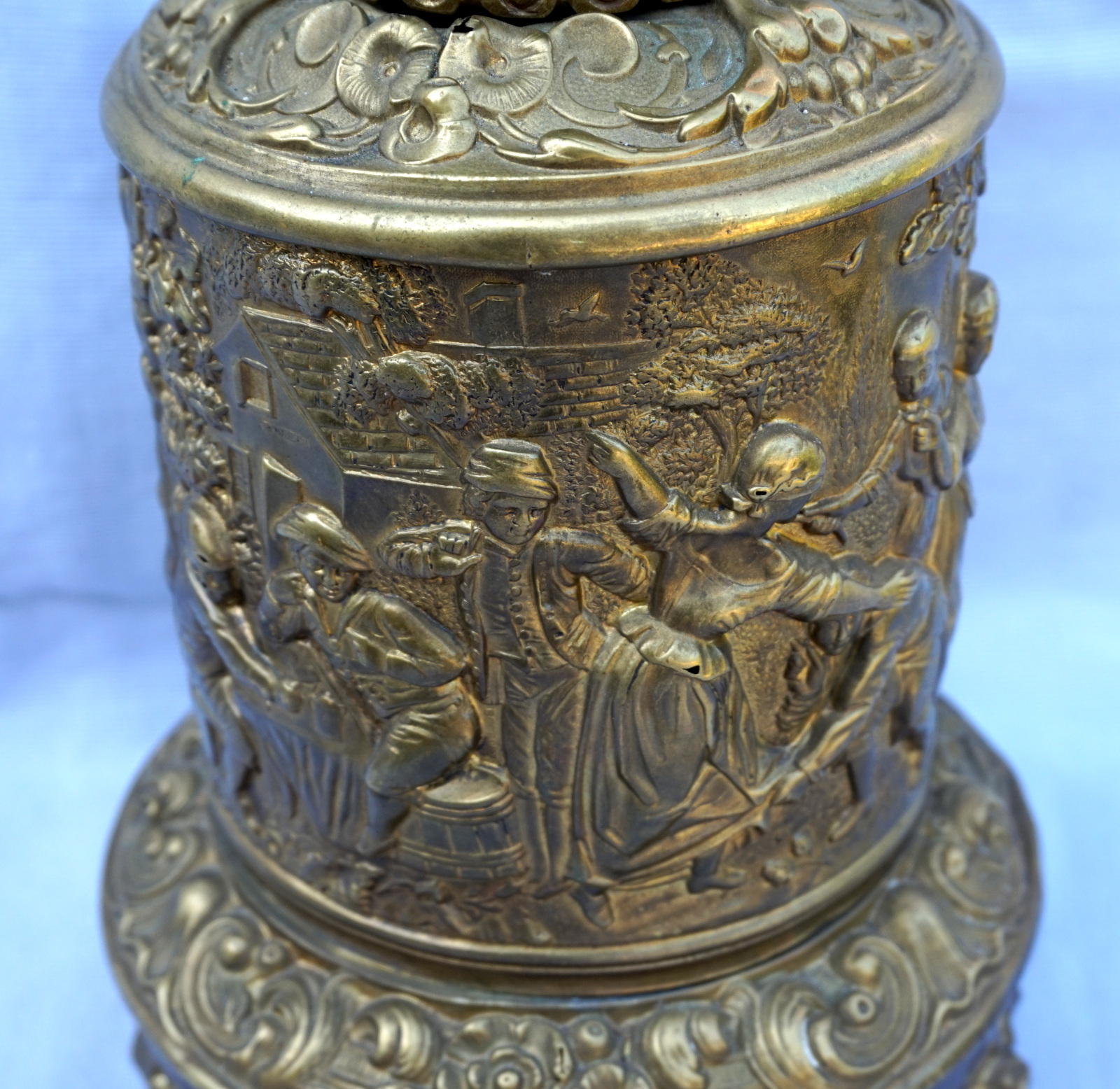 German repousse brass oil lamp showing villagers in front of the tavern made during the 1880's. 12 1/4" (31.5cm) height from the base to the top without burner, 5 " (12.7cm) diameter to the base,weight 1.786 kilogram. It needs repair and reassembly