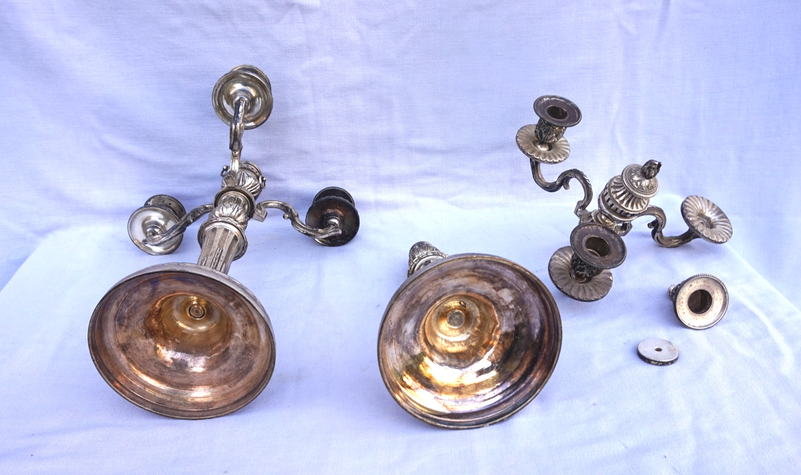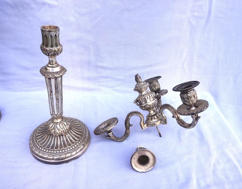 French silver plated brass 3 lights candelabra pair in Louis XVI style made early 19th century. 15" (38.2cm) height, 10 1/2" (26.5cm) diameter to the top. One in good condition , the second needs repairs as shown by