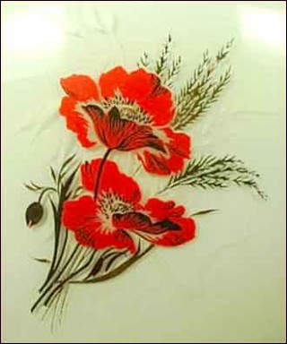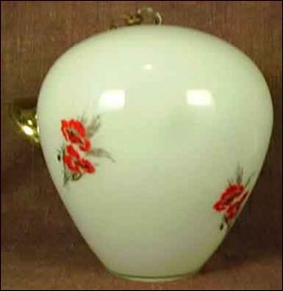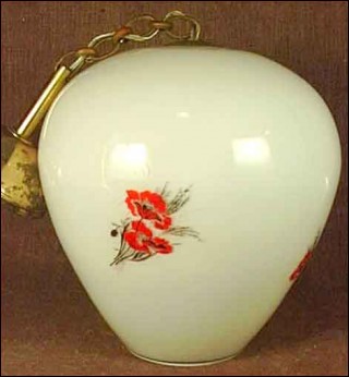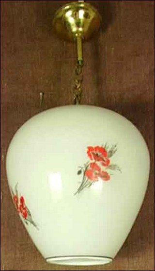 Ceiling in white opaque glass with red poppy and white and golden wild flowers with chain and ceiling mount in brass.It is to the US standard electric. 9"3/4 diameter 11" high without chain and 18"3/4 high overall.