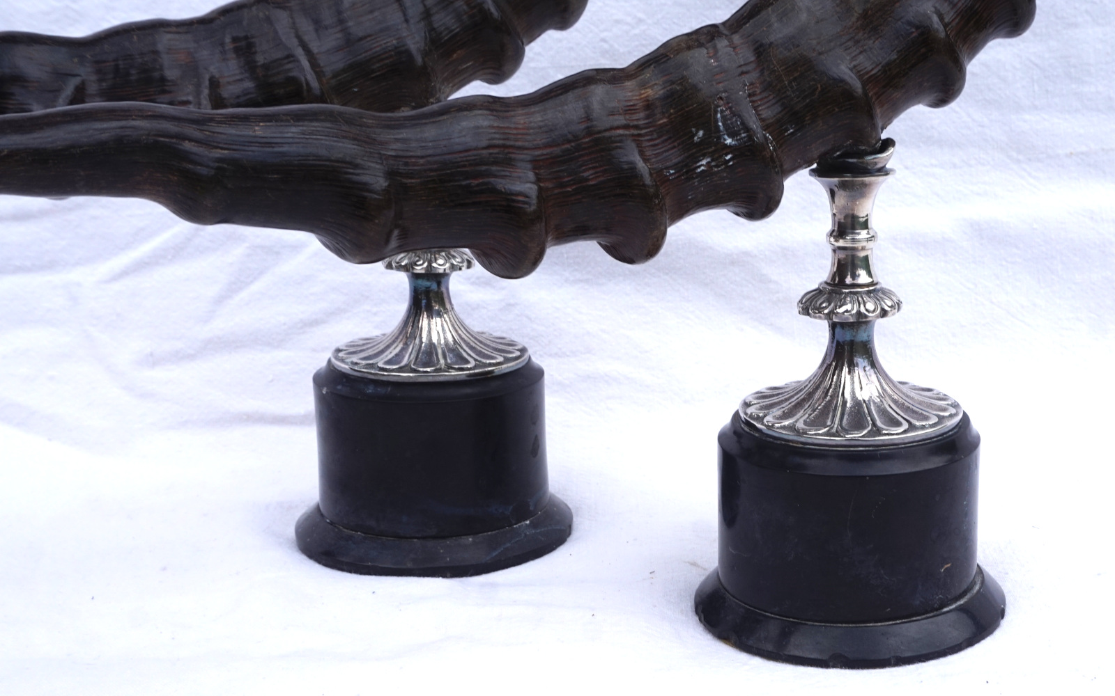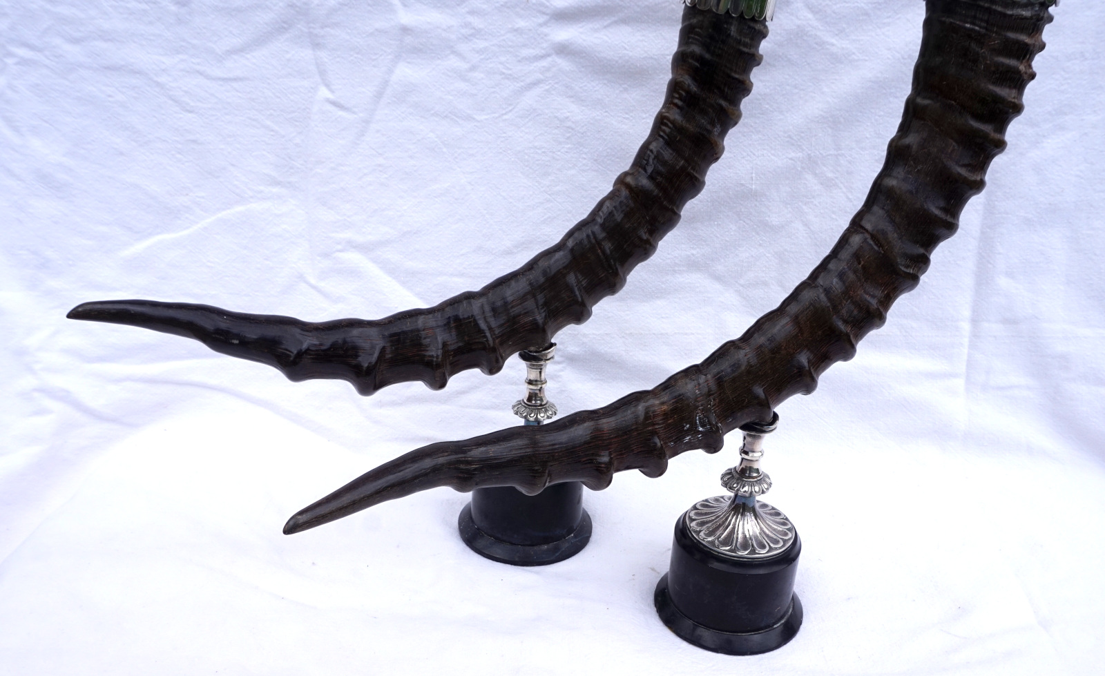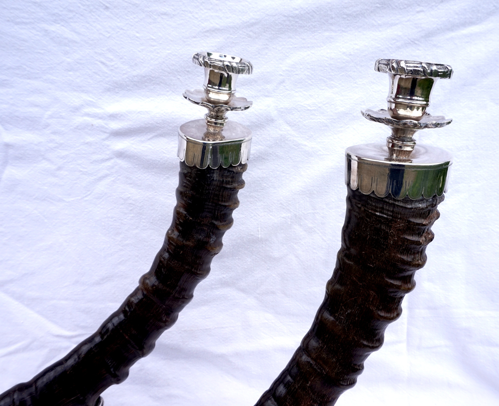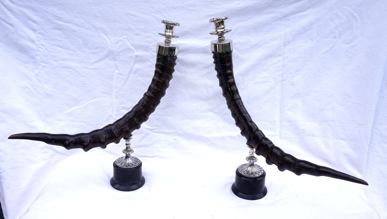 Paire de bougeoirs en cornes de bouquetin  monté métal argenté. Hauteur 42 cm, largeur 43.2 cm, poids 3.560 kg. Bel état, un piètement un peu tordu (mal recollé).