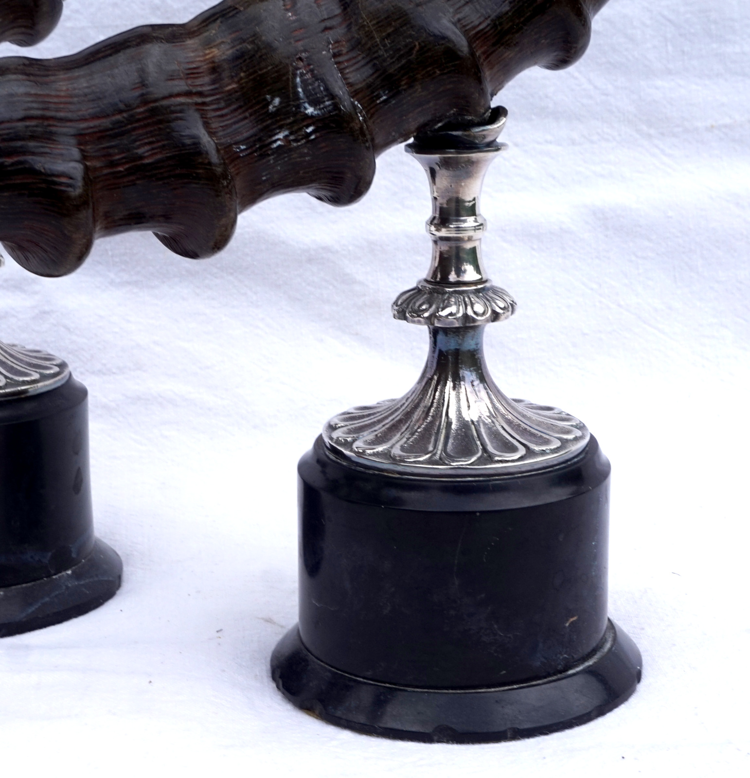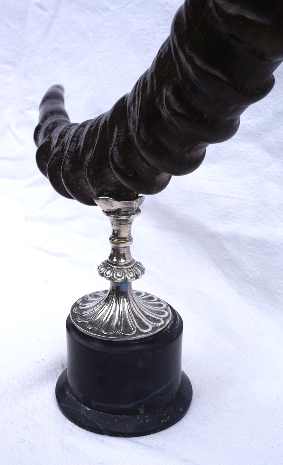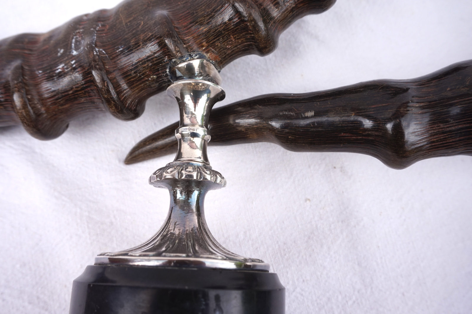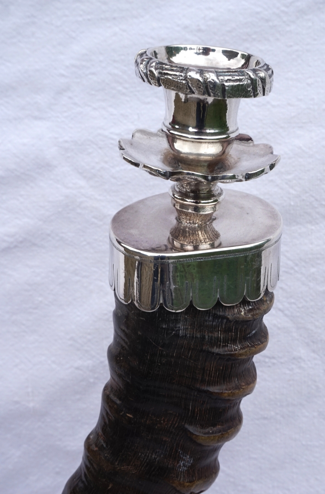Paire de bougeoirs en cornes de bouquetin  monté métal argenté. Hauteur 42 cm, largeur 43.2 cm, poids 3.560 kg. Bel état, un piètement un peu tordu (mal recollé).
