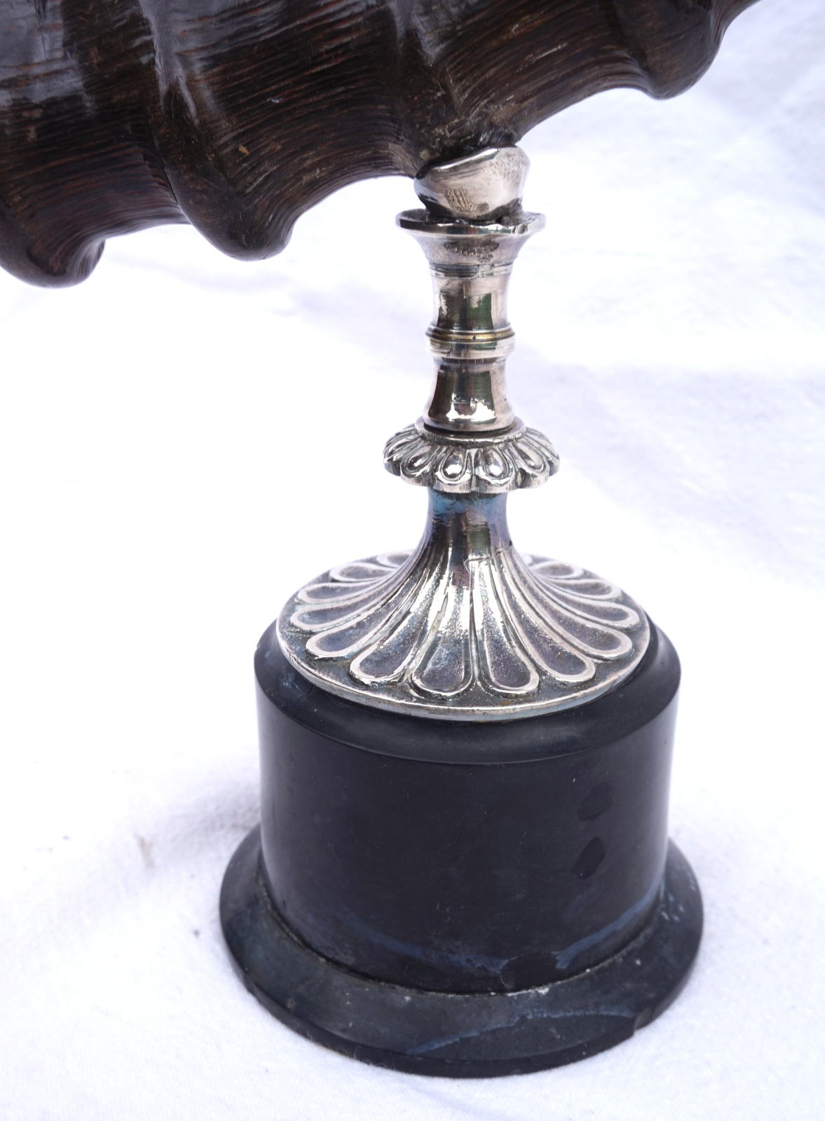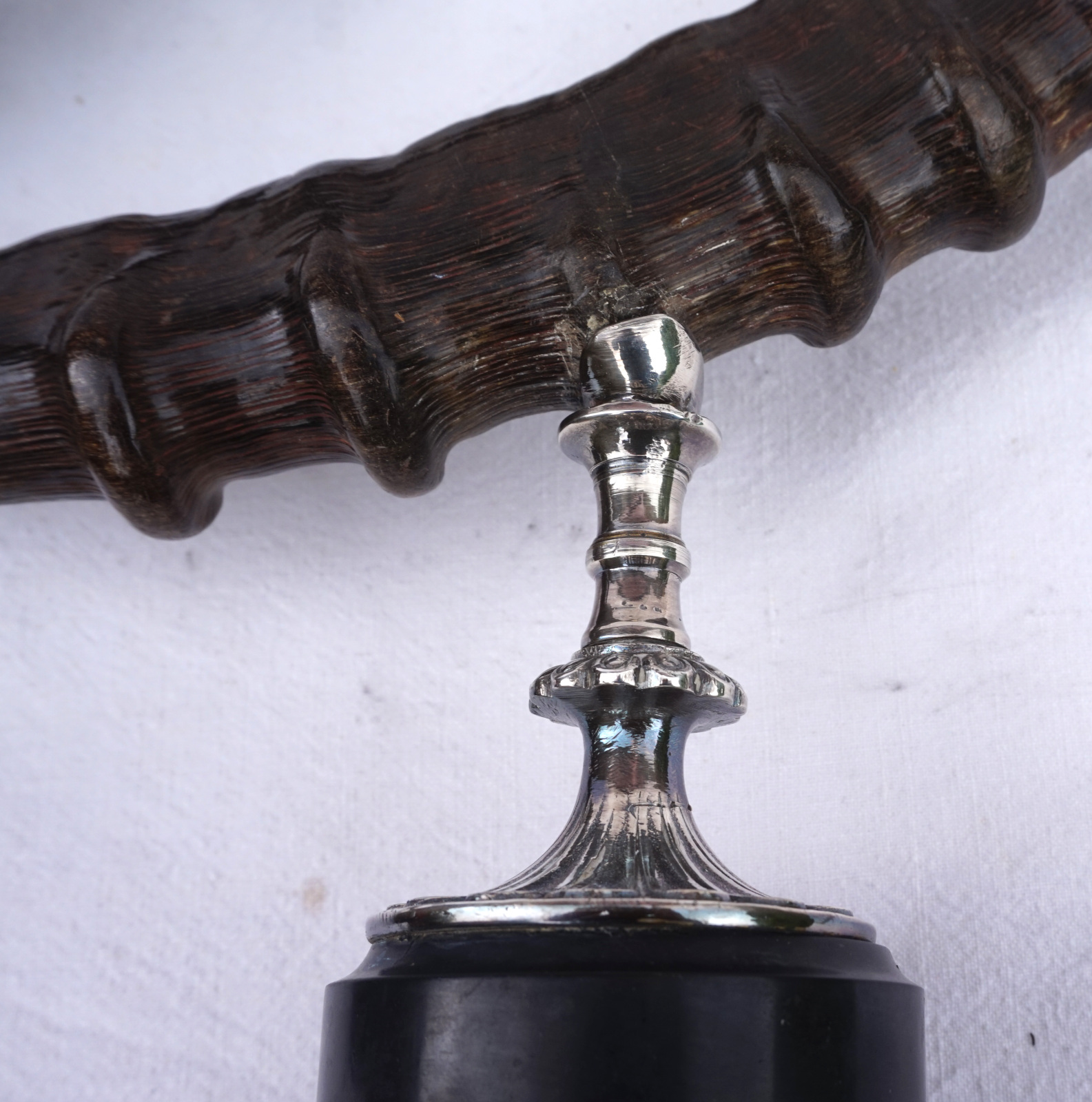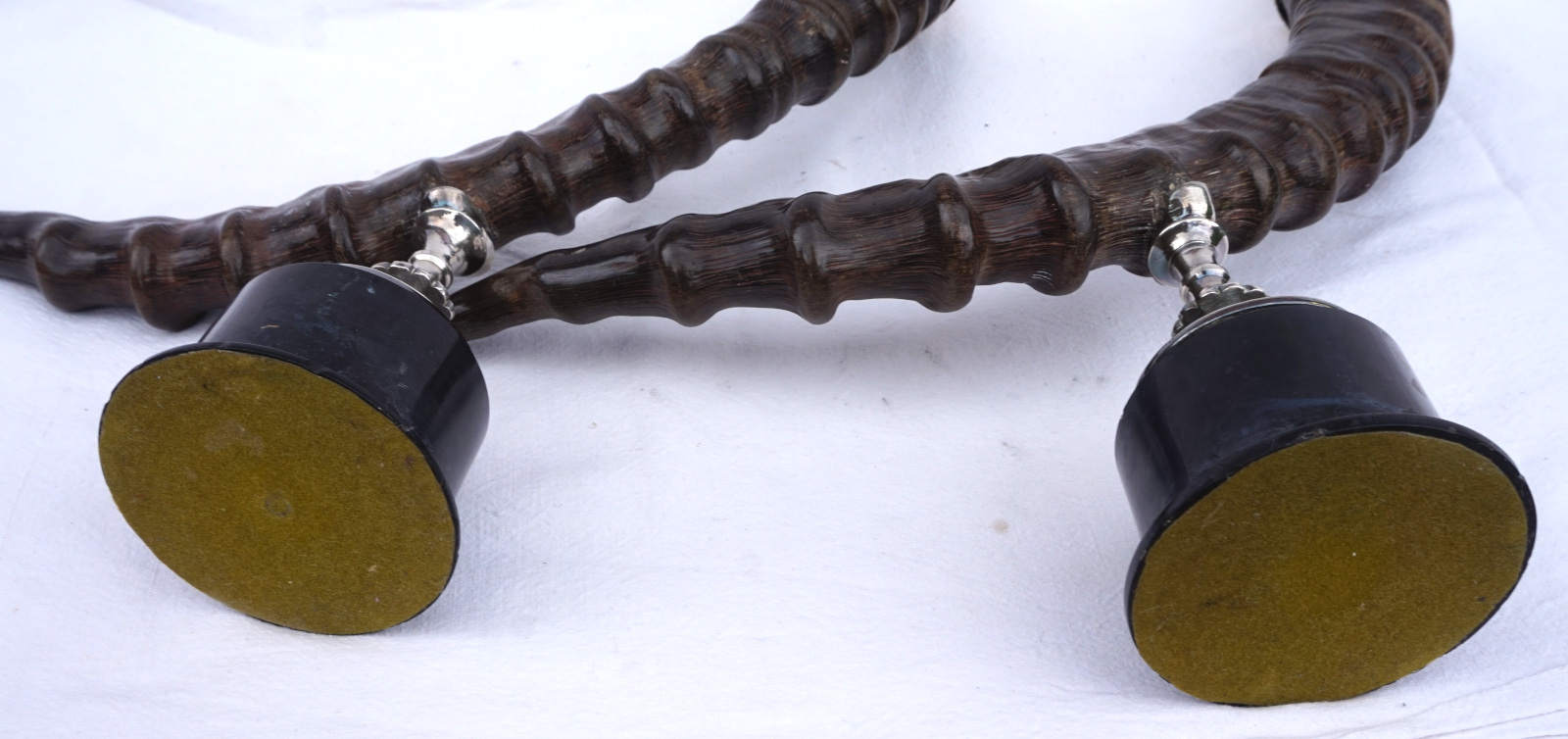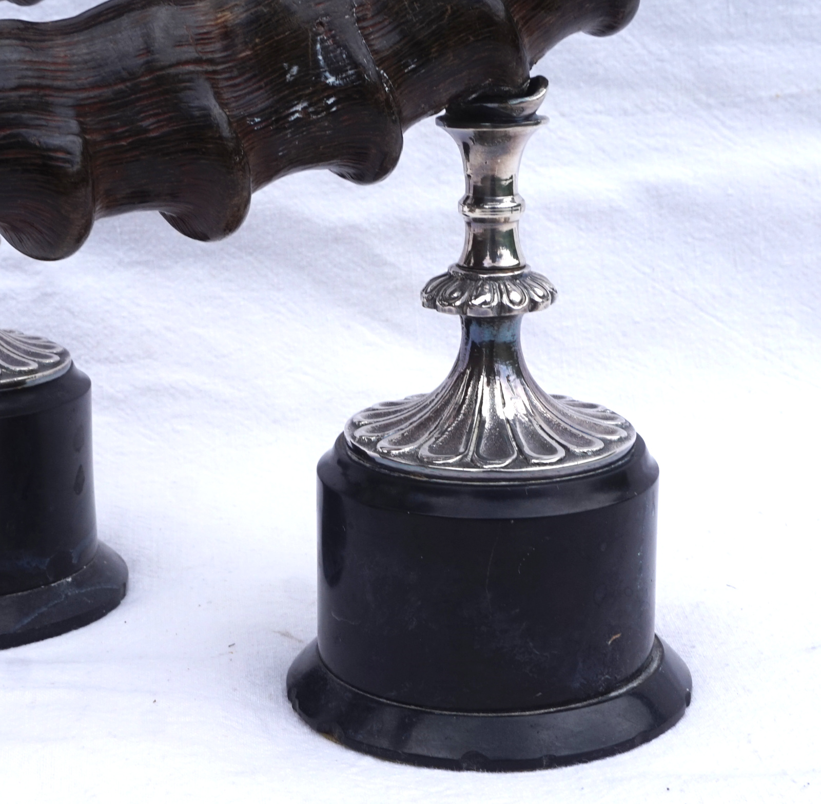 Paire de bougeoirs en cornes de bouquetin  monté métal argenté. Hauteur 42 cm, largeur 43.2 cm, poids 3.560 kg. Bel état, un piètement un peu tordu (mal recollé).