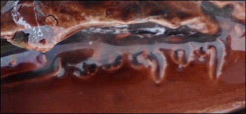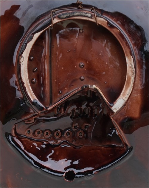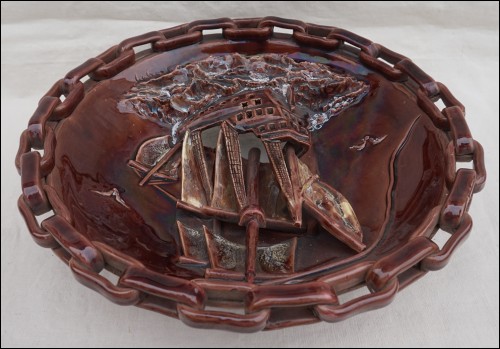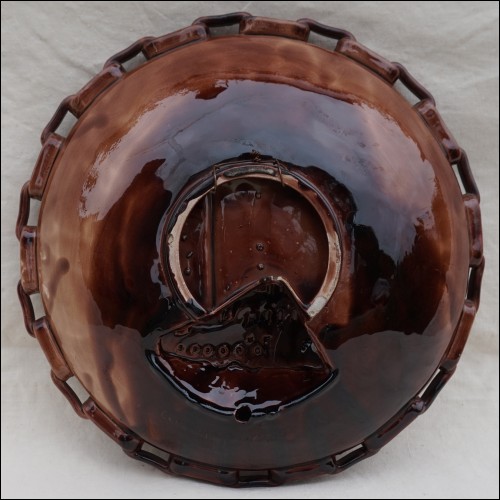 Grand plat en barbotine à une lumière de Vallauris, vers 1960. Applique murale, grand plat creux sculpté en relief d'un galion. Création du céramiste Souchon atelier de la Céramique du Cap à Vallauris. Il est signé Souchon dans le décor et sur le fond. Le voilier est ajouré pour laisser passer la lumière, l'ensemble de couleur cognac est rehaussé d'émail couleur écume de mer. Bon état malgré une petite grenure au dos sur un passage de fil. Diamètre 37 cm.