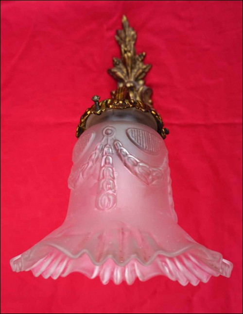 French wall sconce light in gilt brass with frosted glass tuilip shade made during the 1920's. 11 3/4" (30cm) height, 9 1/2" (24.7cm) depth, 5 1/2" (14cm) diameter of the shade. Perfect condition as shown by the following pictures.