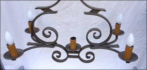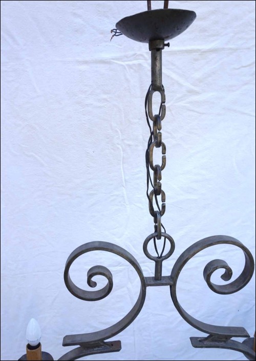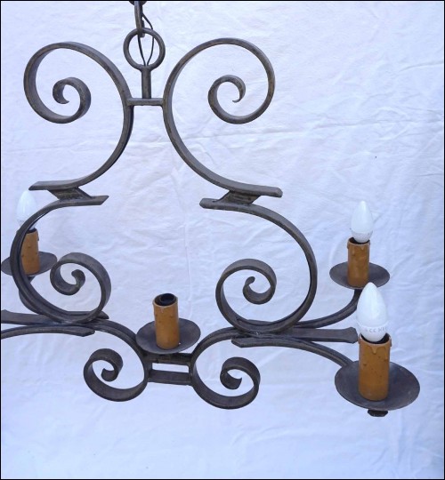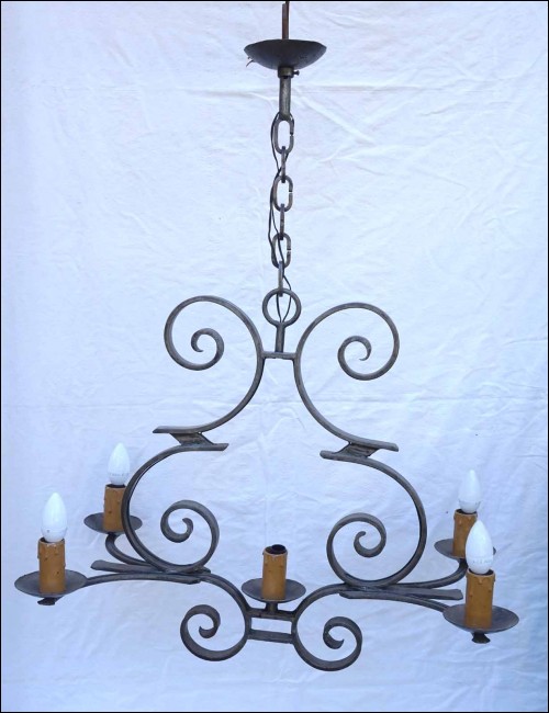 Lustre en fer forgé à 5 lumières. Largeur 72 cm, profondeur 40 cm, hauteur totale avec chaine 95.2 cm, hauteur du fût 61 cm. Parfait état.