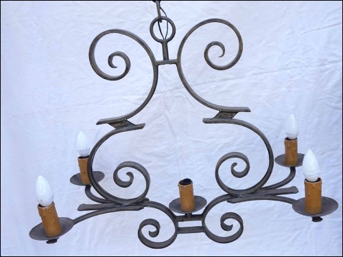 French hand worked wrought iron chandelier with 5 lights made by blacksmith during the mid-century. 28 1/4" (72cm) width, 15 3/4" (40cm) depth, 37 1/2" (95.2cm) total height with chain, 24" (61cm) chandelier height, weight 19lb 2.88oz (8,7 kilograms). Perfect condition as shown by the following pictures.