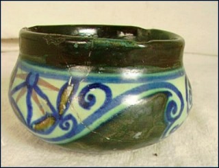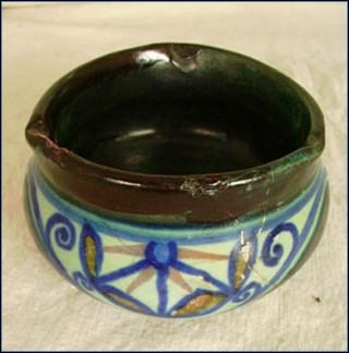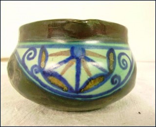 This small Art Deco vase has been made by the KK factory in Holland during the 20's. The Art Deco geometric motif is hand painting on a black background. It has been broken and glued (see picture below). 2"1/5 diam, 2" tall.