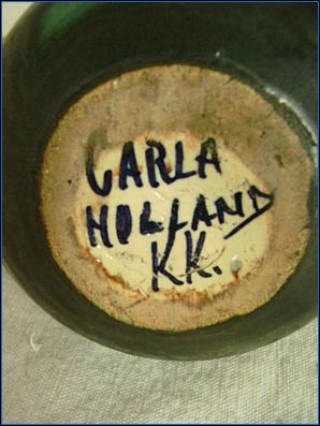 Petit vase Art Déco exécuté dans les années 20 signé Carla Holland KK. Il a été recollé sur un coté, diamètre 6,5 cm, hauteur 5 cm.