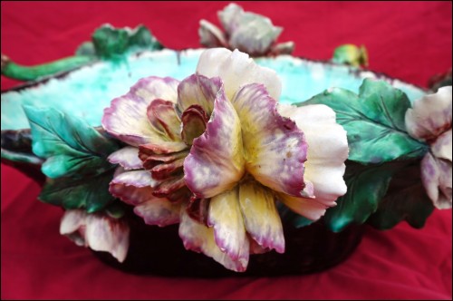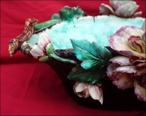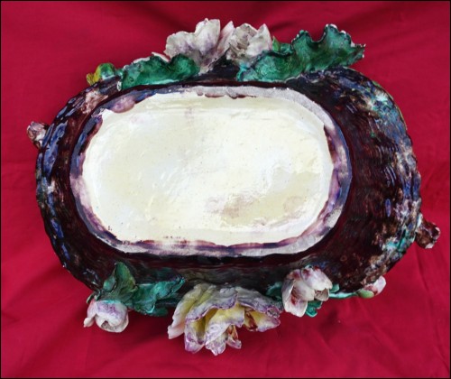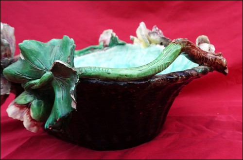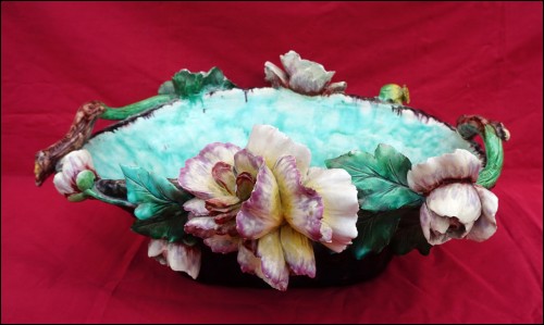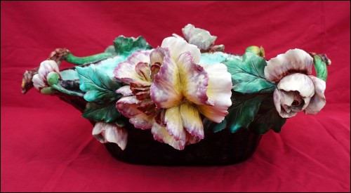 Grand centre de table en barbotine, panier fleuri, certainement Longchamp vers 1890. Longueur 40.5 cm, largeur 36.2 cm, hauteur 18.5cm, poids 3.690 kg. Bel état, quelques manques sur les pétales de fleurs.