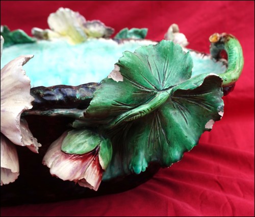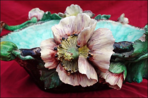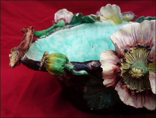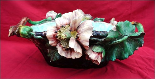 French Art Nouveau larege jardiniere centerpiece basket shaped with poppy foliage and flowers made during the 1890's. 16" (40.5cm) length, 141/4" (36.2cm) width, 7 1/4" (18.5cm) height, weight 8lb 2.16oz (3.690 kilograms). Good condition a few small damage on the flowers as shown by the following pictures.
