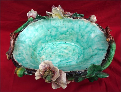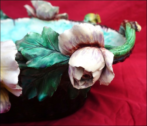 Art Nouveau Large 16" Majolica Basket Jardiniere Center Piece Poppy 1890's