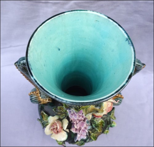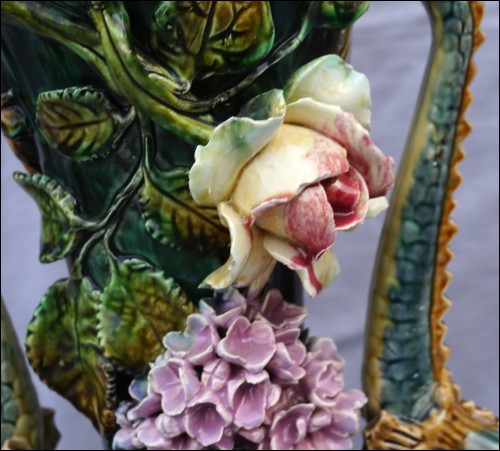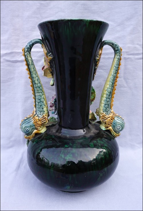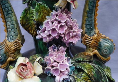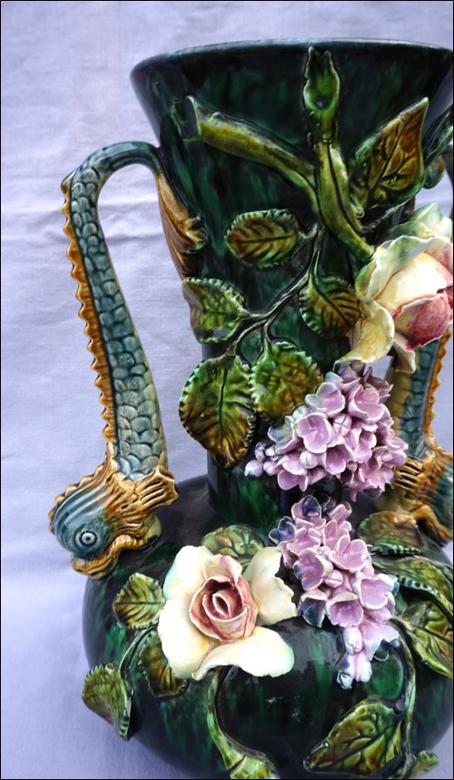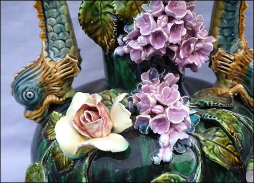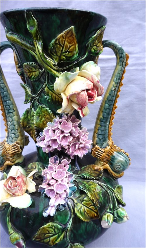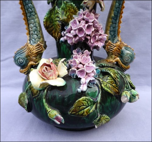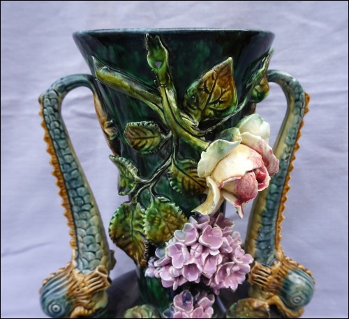 Art Nouveau Majolica Dolphin Flowers Rose Lilac Vase 1900