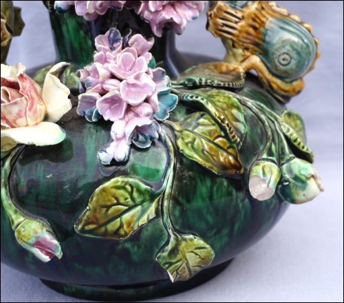 French Art Nouveau majolica vase with flowers, roses, lilac in relief and 2 dolphins for handle made by Montingy during the 1900's. It' numbered and signed on the bottom. 16 1/8" (41cm) height, 8 1/4" (21cm) width to the body. Good condition, tiny chips on the flowers as shown by the following pictures.