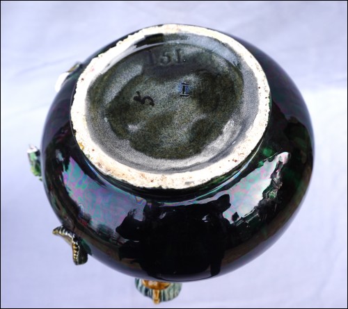 Vase en barbotine à décor de fleurs et de dauphins, Montigny vers 1900. Il est numéroté sur son fond. Hauteur 41 cm, largeur au corps 21 cm. Bel état, quelques éclats dans les fleurs.