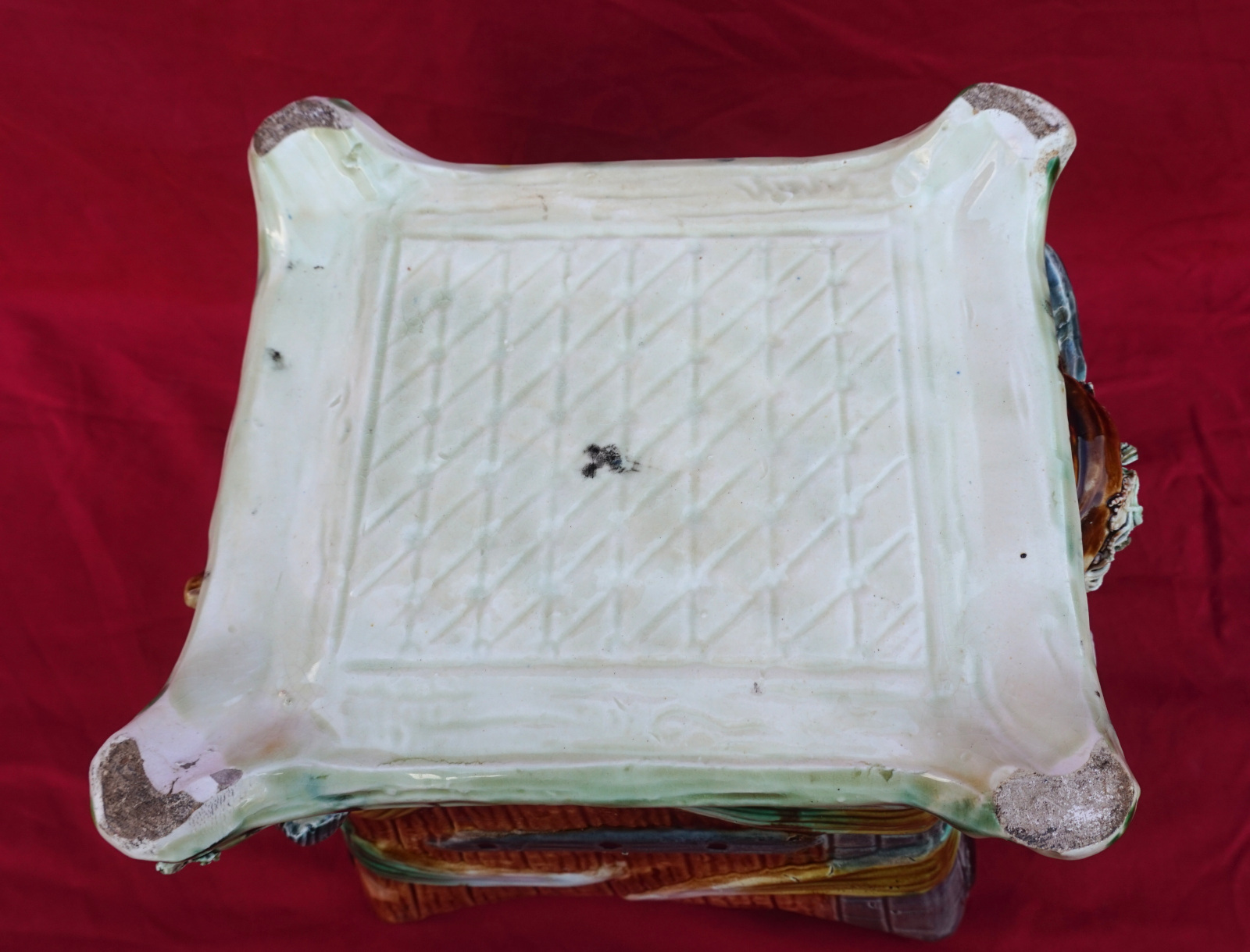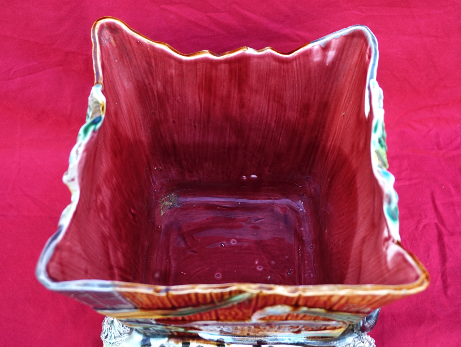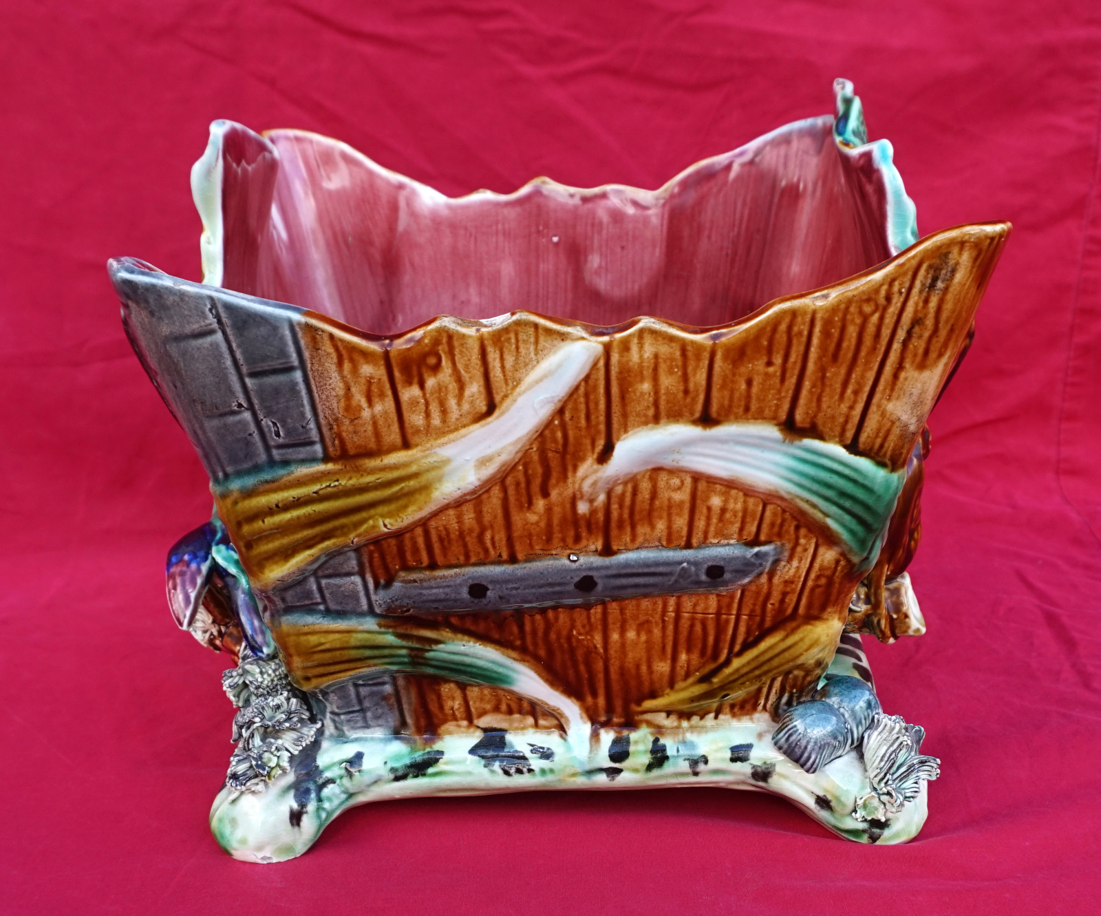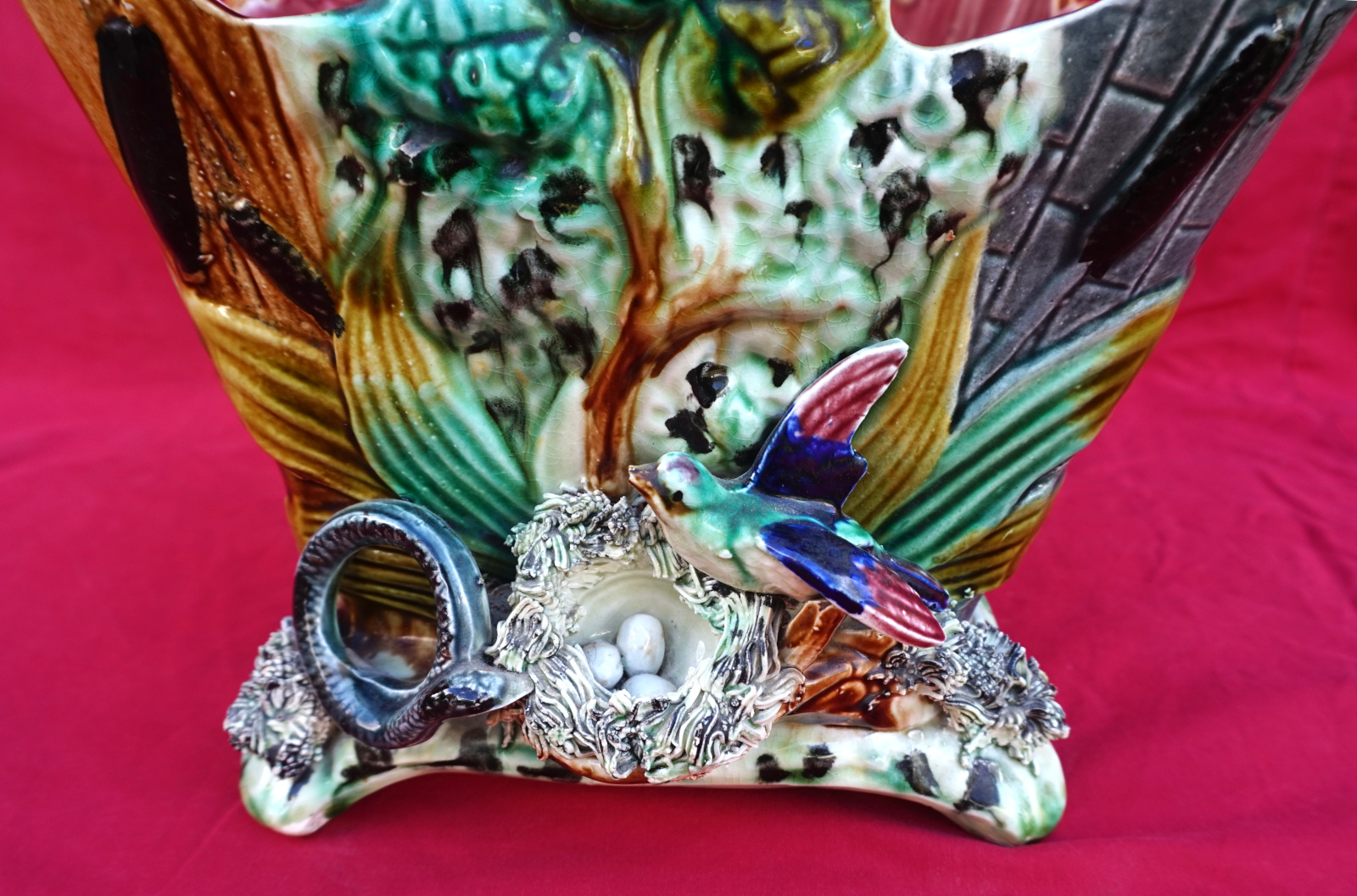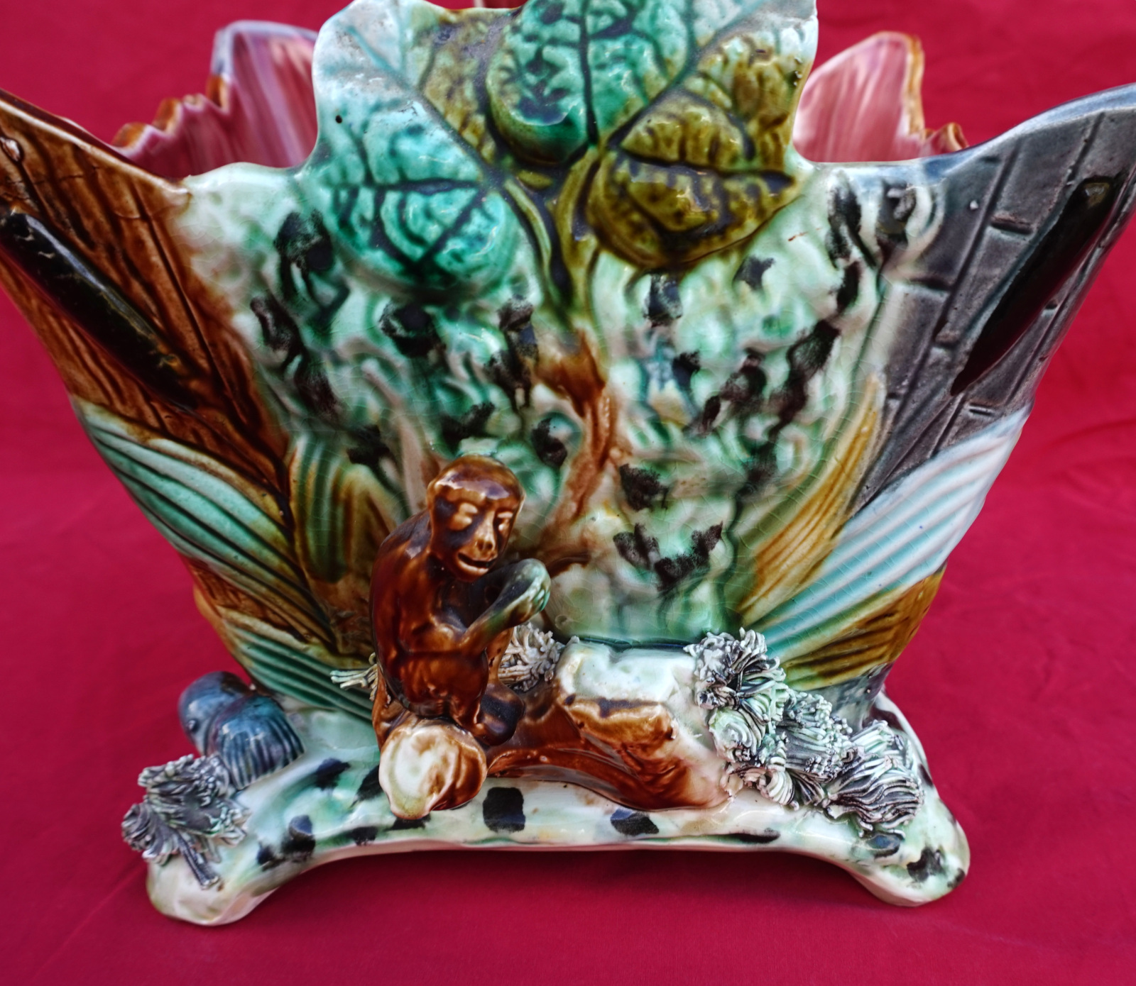 French majolica jardiniere with monkey, bird with eggs in the nest and snake made y Mouzin Lecat in Nimy during the 1900's. It's signed Mouzin Lecat on the back. 9" (22.7cm) height, 9 1/2" 24.2cm width, 9" (22.7cm) depth, weight 7lb 6oz (3.365 kilograms). Perfect condition as shown by the following pictures.
