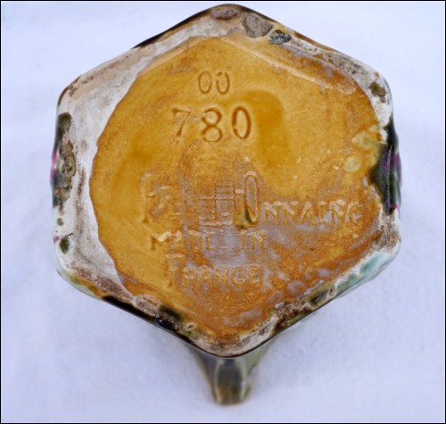 French Art Nouveau hand painted faience model 780 by Onnaing France during the 1900's. It's stamped on the back. 5 5/8" (14.2cm) height, 5 3/8" (13.7cm) width. Perfect condition, a burning flaw on the edge inside as shown by the following pictures.