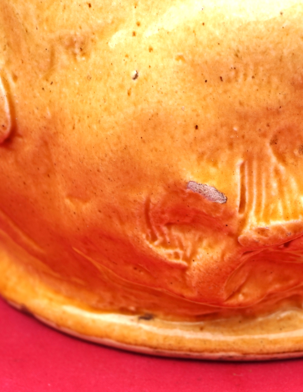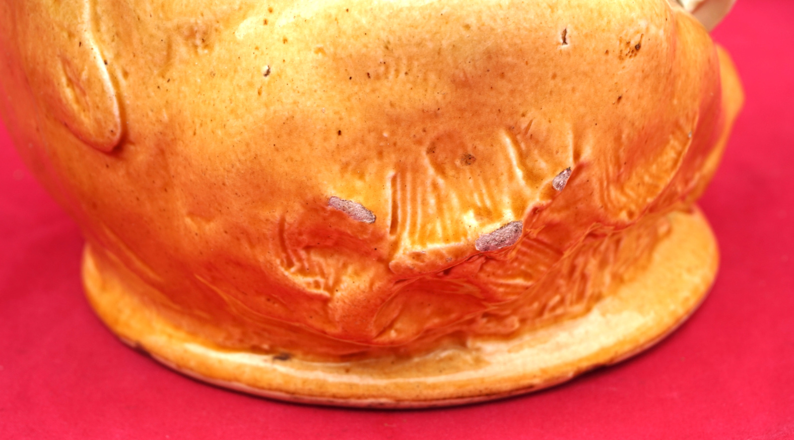 Pichet ours au tambourin et au bâton en barbotine par Georges Dreyfus vers 1910. Il est signé et numéroté sur son fond. Hauteur 22.8 cm, largeur 12.7 cm, profondeur 17.8 cm. Bel état, quelques éclats d'émail, voir photos.