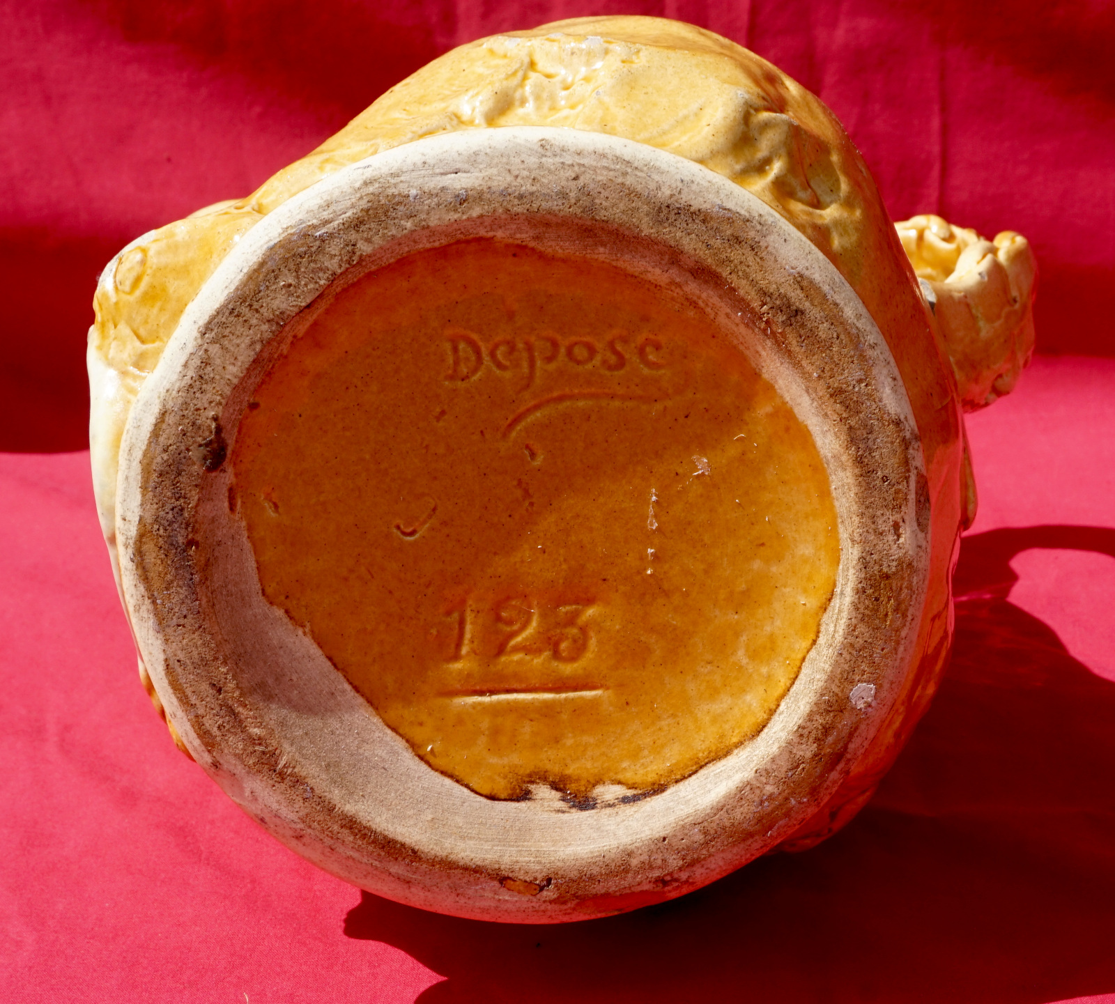 French majolica pitcher bear with tambourine shaped made by Georges Dreyfus during the 1910's. It's signed on the bottom. 9" (22.8cm) height, 5" (12.7cm) width handle to spout, 7" (17.8cm) depth.Good condition a few glaze shortages.