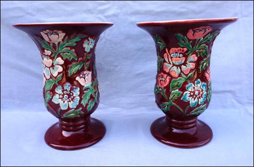French hand painted majolica with relief pair vase made by Ceramic d'Art de Bordeaux (CAB) during the 1940's. They are signed on the bottom. 9 3/4" (24.5cm) height, 7 3/8" (18.6cm) diameter. Perfect condition as shown by the following pictures.
