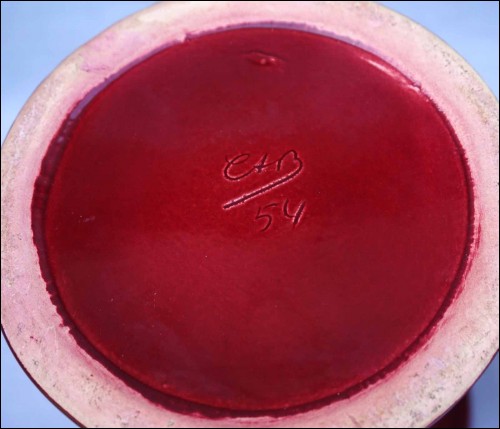 Paire de vases en céramique en relief rehaussé main par CAB, céramique d'Art de Bordeaux, vers 1940. Ils sont signés sur leur fonds. Hauteur 24,5 cm, diamètre au col 18,6 cm. Très bel état.