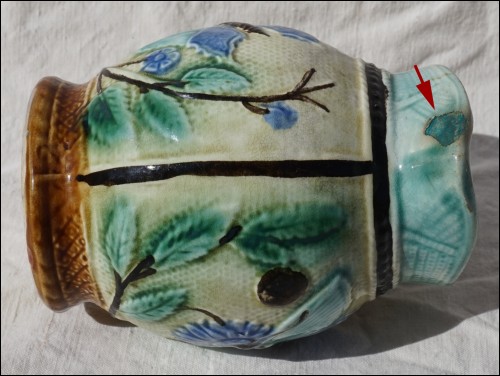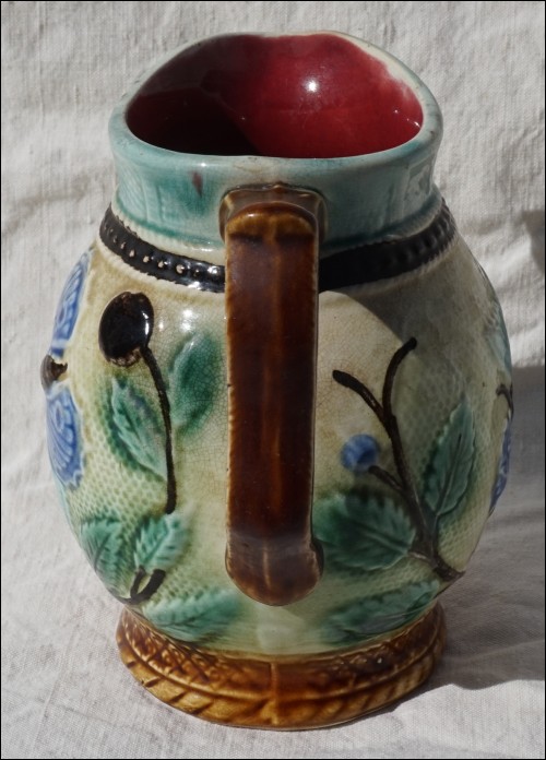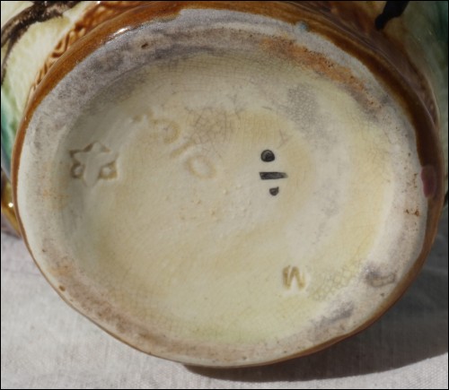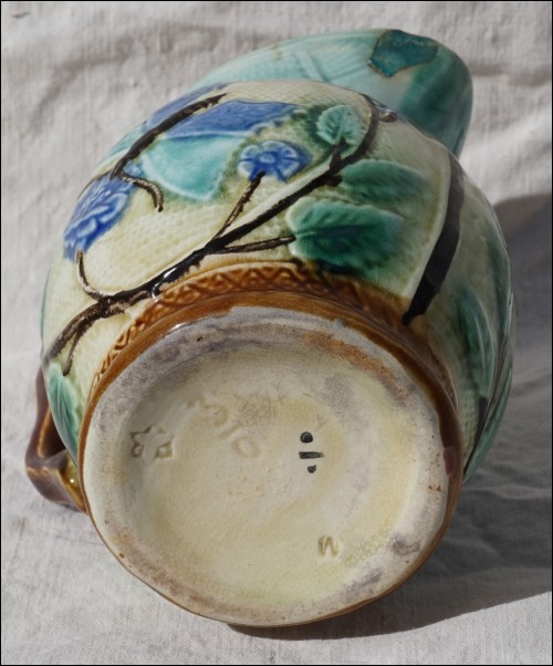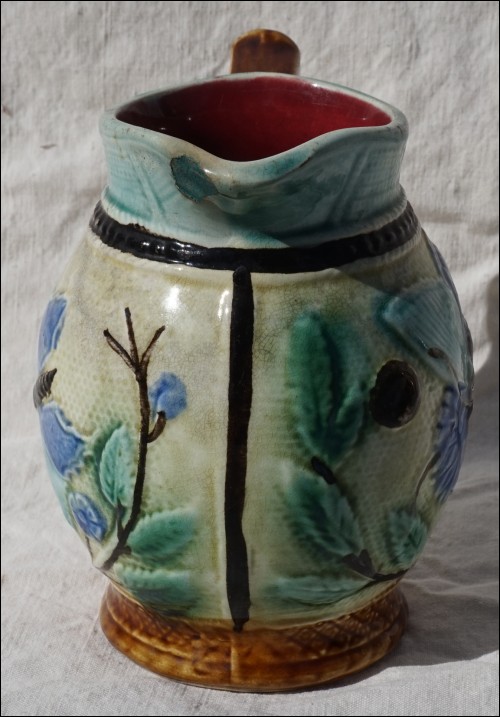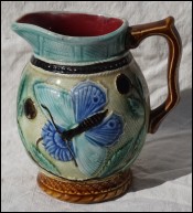 Belgium majolica pitcher showin butterflies and flowers in relief made by Nimy during the 1920's. It's signed on the bottom. 5 1/4" (13.3cm) height, 4 7/8" (12.5cm) width with the handle. A chip on the spout as shown by the following pictures.