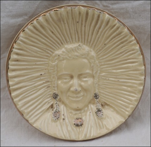 Coupe souvenir, en barbotine rehaussée d'or, de l'exposition internationale de la pêche en 1952 à Boulogne/mer par Massé frères à Désvres. Elle représente une boulognaise en coiffe traditionnelle. Bel état, une égrenure. Diamètre 14 cm.
